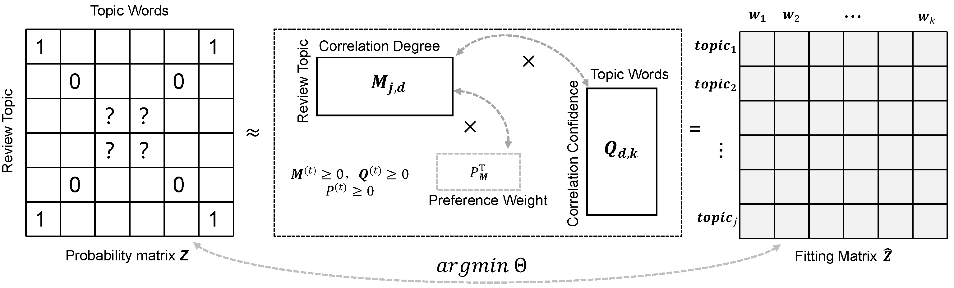 | Review topic words preference weight matrix. | |