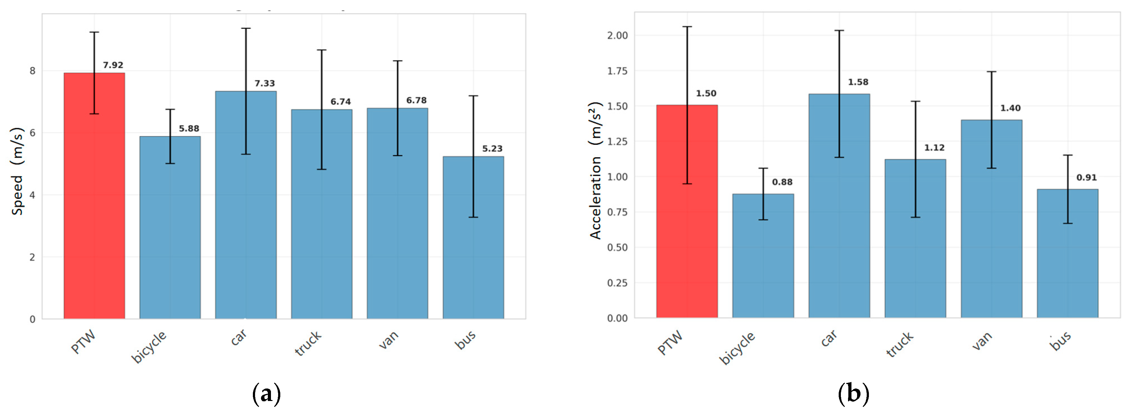 - This study specifically focuses on PTWs, capturing their unique motion patterns in mixed traffic scenarios. This fine-grained analysis enhances behavioral prediction accuracy, contributing to improved safety for autonomous vehicles.