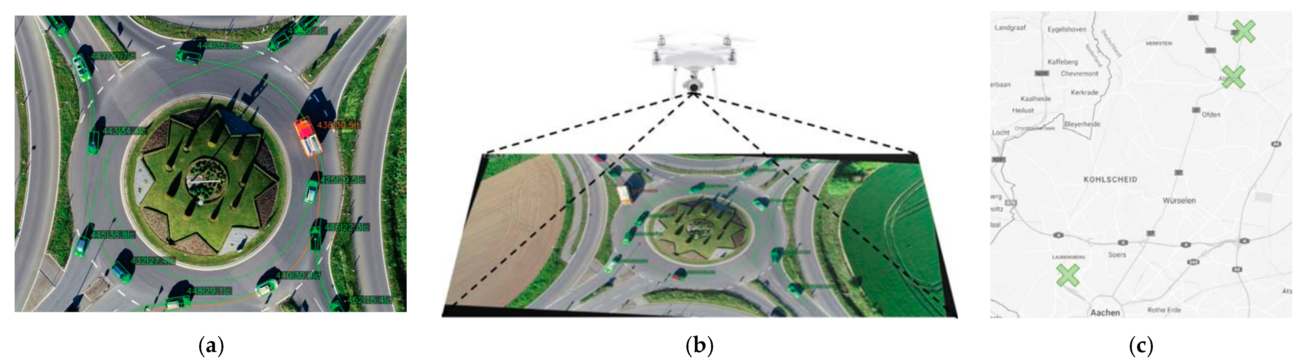 - Krajewski, R.; Moers, T.; Bock, J.; Vater, L.; Eckstein, L. The round dataset: A drone dataset of road user trajectories at roundabouts in Germany. In Proceedings of the 2020 IEEE 23rd International Conference on Intelligent Transportation Systems (ITSC), Rhodes, Greece, 20–23 September 2020; pp. 1–6. [Google Scholar] [CrossRef]