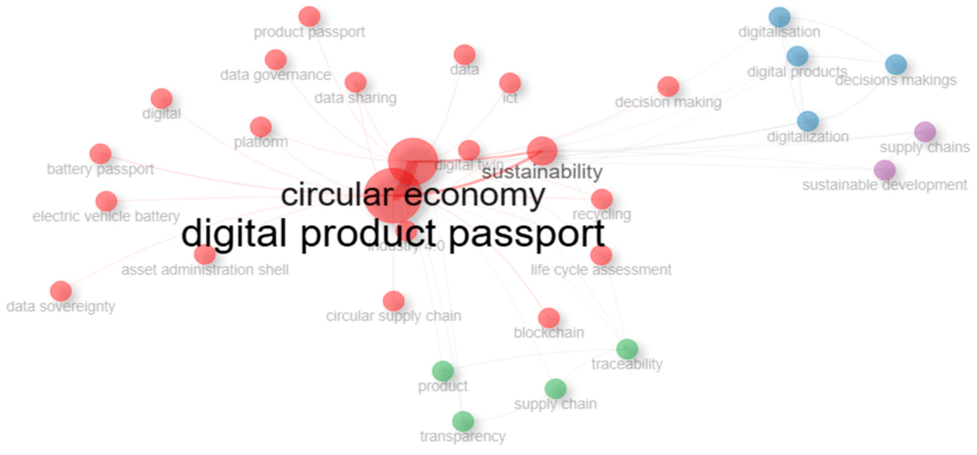 Keyword synchronous matching confirms that the literature is primarily clustered around three main themes: circular economy, sustainability, and traceability. This naturally overlaps with the basic components of the digital product passport concept. However, the relatively low occurrence of technology-specific keywords (e.g., blockchain, IoT, digital twins) points to a gap in the technical-operational dimension of the application, which should be addressed in future interdisciplinary research.