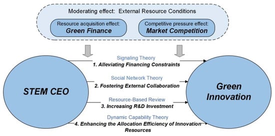 A STEM CEO, defined as a leader with a university degree in a STEM field, significantly influences organizational decisions and outcomes, including traditional innovation [9] and corporate social responsibility [10]. However, little research has investigated their impact on environmental innovation. Furthermore, existing studies have primarily examined their overall impact [11], neglecting their interplay with the external environment. From the perspective of the resource-based view, the development level of external green finance and the intensity of market competition influence a firm’s resource base. Under such conditions, the relationship between STEM CEOs and corporate green innovation may be altered. Consequently, this study systematically addresses two key questions: (1) Can STEM CEOs foster the emergence of corporate green innovation outcomes, and what is the potential mechanism? (2) How does the external environment influence the relationship between STEM CEOs and green innovation?