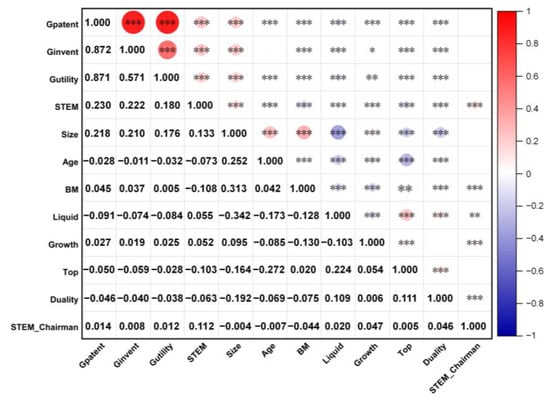 Table 3 presents descriptive statistics for the main variables. To enhance precision and readability while avoiding the loss of key information, this study employs three quantiles [39,79]. The average value of green innovation (Gpatent) among listed companies is 0.320, with a maximum of 2.708, a minimum of 0.000, and a standard deviation of 0.634. This indicates a significant variation in the level of green innovation among Chinese companies, with an overall low level of green innovation and considerable room for improvement. After distinguishing between types of green innovation, there are significant differences between companies in terms of substantive green innovation (Ginvent) and strategic green innovation (Gutility), suggesting that the green innovation performance of Chinese companies requires further enhancement. The average value of having a STEM CEO (STEM) is 0.354, meaning that between 2010 and 2023, approximately 35.4% of the sample companies had a CEO with a STEM educational background. All control variables fall within reasonable limits.