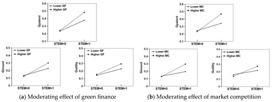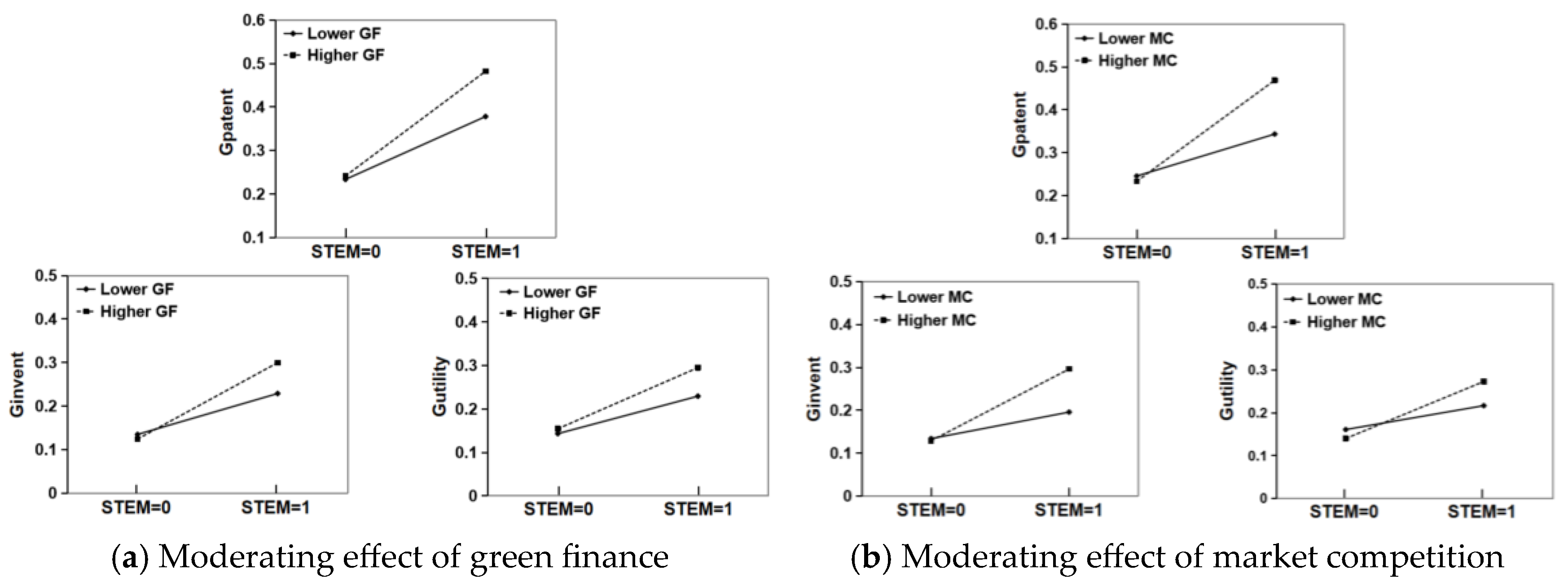 Compared with conventional finance, green finance emphasizes financial support for environmental protection and pollution reduction, and is more supportive of green investment projects [68,69]. Bai et al. [70] found that green finance can provide enterprises with necessary funding and policy support, thereby promoting strategic green innovation. This implies that STEM CEOs can not only leverage their specialized knowledge and networks to attract traditional investment, but also supplement these efforts through green financing products, thereby channeling green capital specifically towards R&D activities [28]. Furthermore, an elevated level of green finance signals a nation’s commitment to the development of green and low-carbon industries [71]. STEM CEOs can quickly recognize the advantages of green finance. They can leverage relevant policies to secure additional financial resources for firms, thereby promoting green innovation.