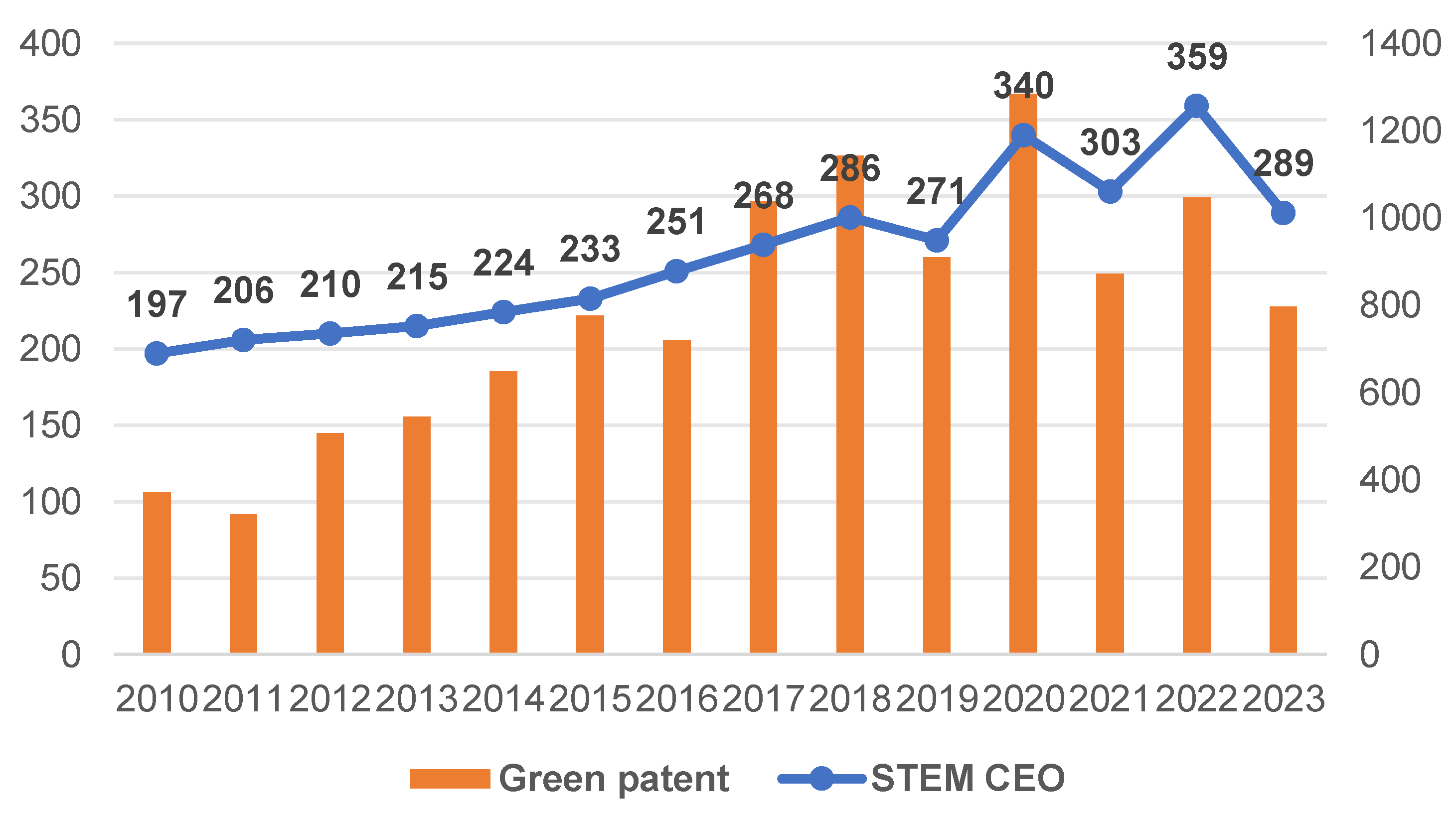 However, the role of a CEO’s educational background remains underexplored. STEM education represents the integration of science, technology, engineering, and mathematics education. STEM education—emphasizing interdisciplinary literacy, innovation, and social responsibility—aims to nurture talent capable of applying scientific and mathematical knowledge to environmentally sustainable practices [7]. According to the U.S. Department of Homeland Security (DHS) STEM Designated Degree Program List, STEM majors include Science, Engineering, Agriculture, and Medicine. The STEMM Opportunities Alliance identifies STEM talent as a key driver of national innovation and sustainability. Scientific foundations provide the theoretical underpinnings for green R&D, while an engineering mindset drives the practical implementation of green solutions. Furthermore, training in agronomy and medicine instills a systems perspective, a long-term orientation, and a deep respect for nature. This unique combination of disciplines enables STEM professionals to internalize green sustainable development, transforming it from a mere slogan into a core corporate strategy [8]. Figure 1 indicates that the total number of green patents among Chinese manufacturing firms increased alongside the growth in the total number of STEM talents from 2010 to 2023. Therefore, STEM talents are critical for the R&D of green technologies, and firms require such talents to propel green innovation.