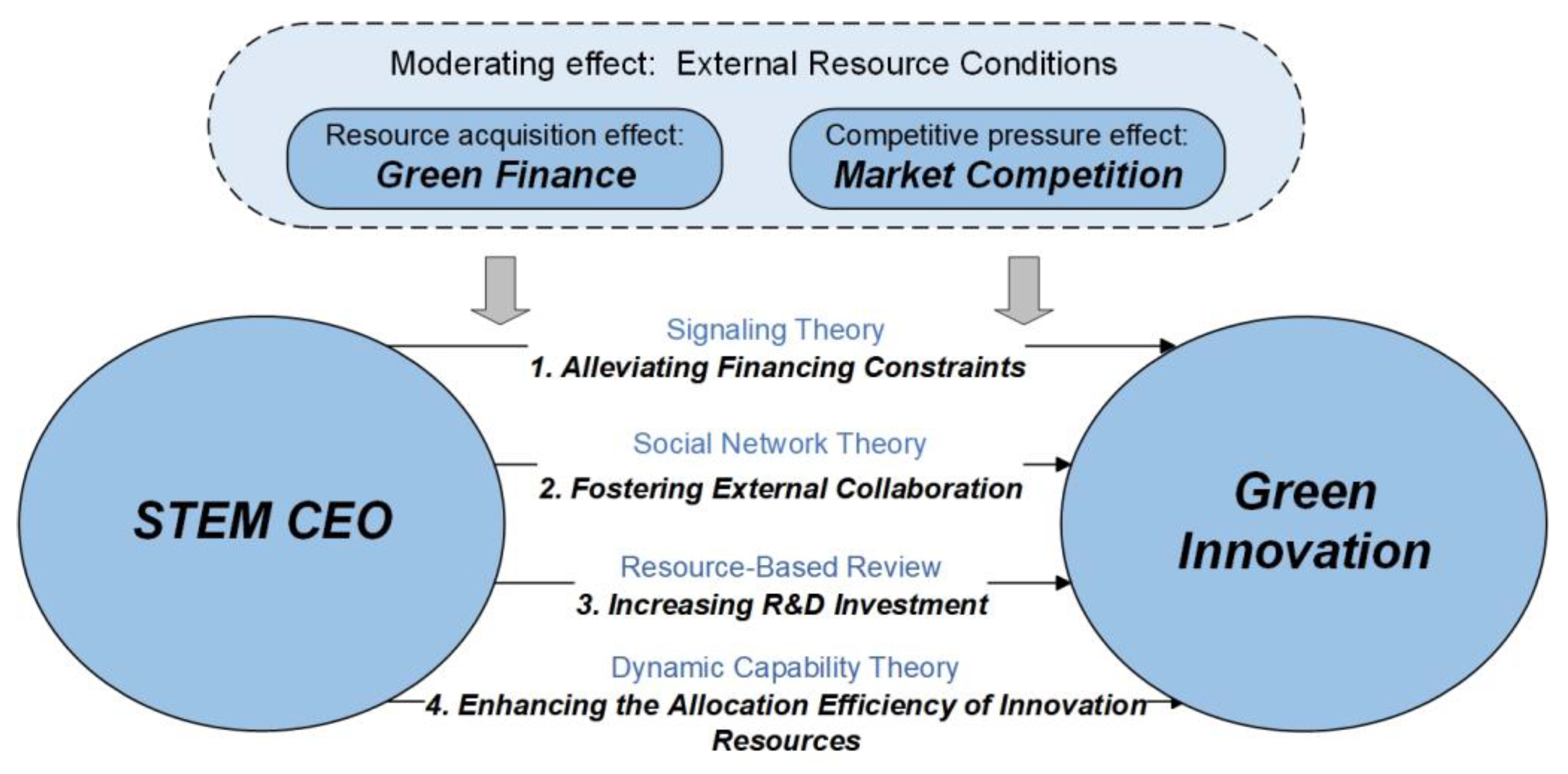 According to upper echelons theory, executives’ value orientations and cognitive abilities significantly influence corporate decision-making processes and strategy implementation [14]. In the context of STEM CEOs, upper echelons theory provides profound insights into how executives’ specific backgrounds and expertise influence the advancement of green innovation. To further elucidate how STEM executives influence corporate green innovation, this study integrates signaling theory [76], social network theory [55], the resource-based view [62], and dynamic capabilities theory [77] to examine how STEM CEOs can empower corporate green innovation systems through resources, collaboration, innovation, and coordination. In addition, CEO characteristics interact with the external environment [39]. This study explores how the impact of STEM CEOs on corporate green innovation varies under different external resource conditions.