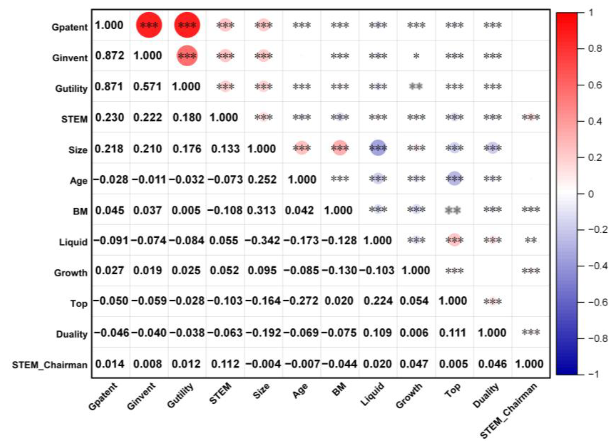 Hsieh et al. [9] used control variables such as the current ratio and sales growth rate, while Huang et al. [39] included firm size, firm age, and CEO duality. Based on these, several control variables were included: firm size (Size), firm age (Age), book-to-market ratio (BM), current ratio (Liquid), sales growth (Growth), shareholding ratio of the top ten shareholders (Top), CEO duality (Duality), and the chairman’s STEM background (STEM_Chairman). The definitions of these variables are summarized in Table 2.