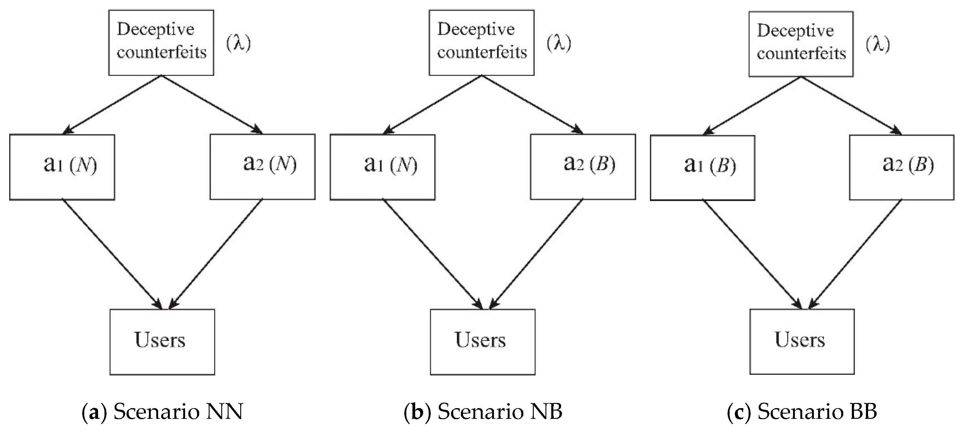 The issue of counterfeiting has been the subject of academic research since the 1980s. Grossman and Shapiro [5] classify counterfeit products into two categories: non-deceptive and deceptive counterfeits. Non-deceptive counterfeits are those that consumers can distinguish from brand-name products. Deceptive counterfeits exhibit physical characteristics that are nearly indistinguishable from those of authentic products, rendering it impossible for consumers to ascertain whether a product is authentic or counterfeit. The literature on counterfeit goods encompasses a multitude of disciplines, including parallel imports [6], intellectual property rights [7], inventory management [8], and consumers’ behavior [9,10].