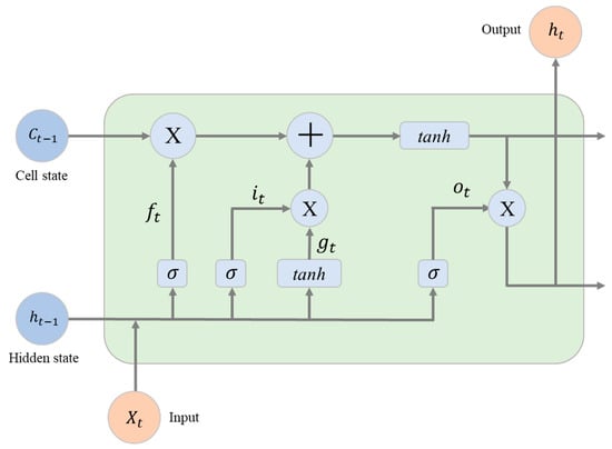 The RNN model known as LSTM was introduced by Hochreiter and Schmidhuber [45] and is widely used for time series data forecasting and learning. If there is a large distance between the relevant information and the point of using the information, the classic RNN is known to have a substantially lower gradient while backpropagating. The vanishing gradient problem is the resulting considerable decline in learning performance. By including a cell state in addition to the hidden state of a standard RNN, LSTM is suggested as a solution to this issue [46,47]. LSTM excels in preserving and utilizing crucial information across prolonged time intervals, showcasing its proficiency in handling long-term dependencies [48]. The formulations of the LSTM structure are presented as follows: