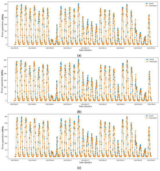 One of the key objectives of this study is to determine the optimal model by analysing the structure and forecasting performance of the stacked ensemble models based on different datasets. An ensemble model is a model that combines the forecasting results of multiple base models to derive a final forecasting, and this study used LightGBM and XGBoost as the base models and LightGBM as a meta-model. The detailed structure of the best model for each variable in the stacked ensemble model is shown in Table 4. The ratios in parentheses in this table represent the relative weight contributions of each base model estimated by the meta-learner in the stacked ensemble. In addition, the actual and forecasted values for the evaluation data of the PV power generation forecasting model for each combination of variables in the stacked ensemble model are described in Figure 4. The horizontal axis represents the time index of the test data, and the vertical axis represents the PV power generation. Here, the blue line represents the actual value, the orange line represents the forecasted value, and the gap between the blue and orange lines on the same vertical axis represents the error of the PV power generation.