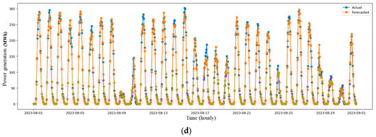 Graph of the stacked ensemble model’s PV power forecasting: (a) Weather; (b) Weather + PM; (c) Weather + GHG; (d) Weather + PM + GHG.