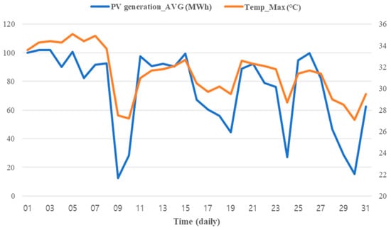 Daily average trend of PV generation and temperature in Gyeongnam (August 2023).