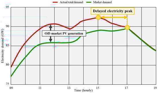 While 25 degrees Celsius is the optimum temperature for solar panels to generate maximum power [58], solar power can still generate enough electricity during heat waves (daytime highs of 33 degrees Celsius or higher). For example, in South Korea in August 2023, solar power met 20.0 per cent of the country’s electricity demand during a sustained heat wave. On 3 August, South Korea experienced a surge in electricity demand due to the heatwave, with some areas experiencing ultra-tropical nighttime temperatures of over 30 degrees Celsius. From 0:00 to 13:00, the solar power generation was 17,843 MW, accounting for 20 per cent of the total actual demand (89,213 MW). From 13:00 to 14:00, the total demand was recorded at 91,718 MW and solar power generation at 17,594 MW (19.2%), by the Korea Power Exchange (KPX). Increased solar power generation during peak hours in the summer means that additional power can be supplied during peak hours by solar power instead of LNG, which emits greenhouse gases. In addition, until 2016, the peak hours for summer electricity consumption in South Korea were 14–15 h, which has shifted to 16–17 h since 2021 (Figure 6). As of July 2021, the total solar capacity in South Korea was about 20.3 GW, comprising solar power traded on the electricity market (5.1 GW), solar power generated through power purchase agreements (PPAs) with KEPCO (11.5 GW), and solar power for home use (3.7 GW). Of these, 5.1 GW (about 25 per cent) is registered in the electricity market, with real-time metering. The remaining 75% is unmetered and is only accounted for in demand forecasts. Therefore, the shift in peak demand to the late afternoon is a result of unmetered solar covering the midday demand, and it can be concluded that solar power is making a significant contribution to demand reduction and supply capacity.