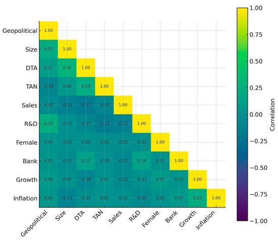 We now proceed to address potential multicollinearity issues within the dataset. Presenting the correlation matrix of the explanatory variables is a critical step, as it provides initial insights into the strength and direction of the linear relationships between covariates. Detecting high pairwise correlations is essential to ensure that the estimated coefficients are stable and interpretable, and that the explanatory power of each variable is not artificially inflated by overlapping information. Figure 1 displays the lower triangular correlation matrix, including the diagonal, which highlights moderate associations between some financial indicators, while also reassuring us that no excessively strong correlations are present that would threaten the reliability of the regression analysis. This diagnostic step enhances the robustness of the econometric specification and supports the credibility of subsequent inferences about the drivers of profitability.