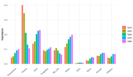 The results presented in Figure 3 indicate that geopolitical risk has a distinctly distribution-dependent role in shaping profitability. Its relative importance is limited at the extreme tails (10th and 90th percentiles), suggesting that very weak firms may already be constrained by internal inefficiencies, while top-performing firms are more resilient and better able to absorb shocks. By contrast, geopolitical risk becomes more influential in the central part of the distribution, with its highest importance around the median and upper-middle quantiles (50th and 75th). This pattern implies that firms with moderate or moderately high profitability are most exposed to external uncertainty, potentially because they are more engaged in international trade, global supply chains, or investment projects sensitive to political instability. Compared with structural firm-level factors such as total assets or leverage, geopolitical risk exerts a more selective but strategically significant influence, reinforcing the need to account for external shocks when assessing profitability dynamics.