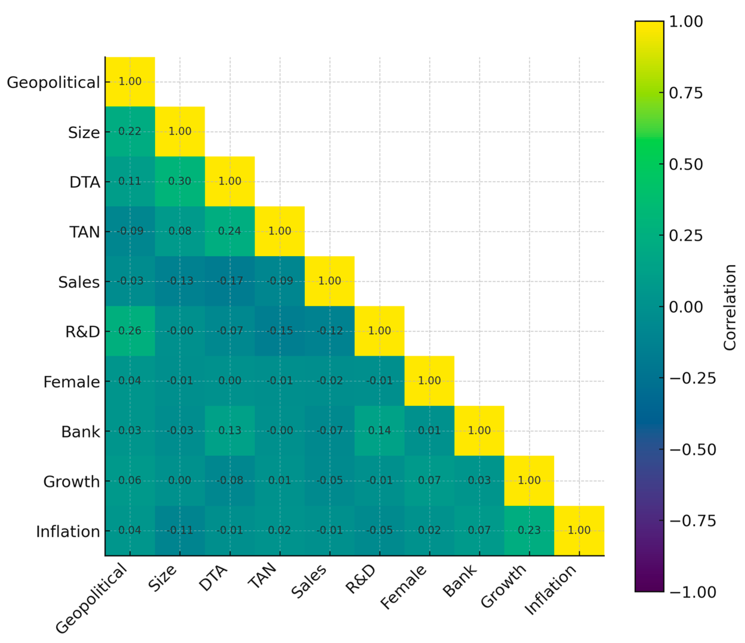 Figure 1 displays the lower triangular correlation matrix, including the diagonal, which highlights moderate associations between some financial indicators, while also reassuring us that no excessively strong correlations are present that would threaten the reliability of the regression analysis. This diagnostic step enhances the robustness of the econometric specification and supports the credibility of subsequent inferences about the drivers of profitability.