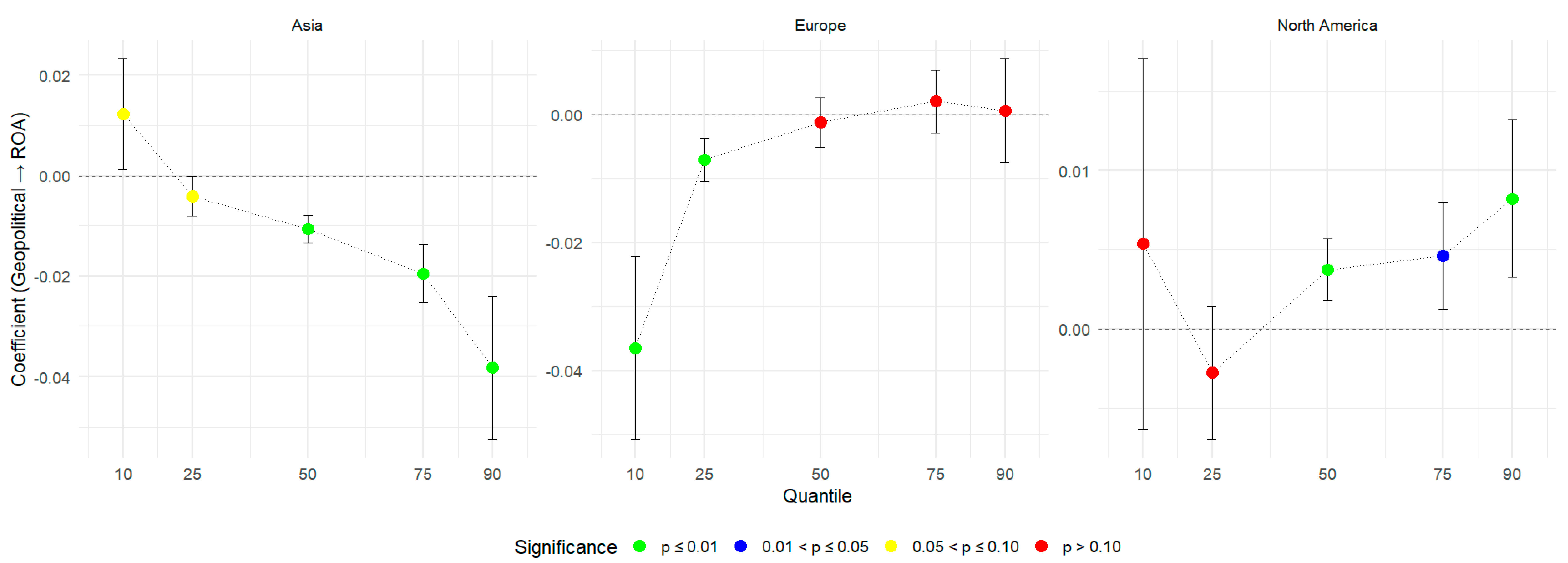 In Europe, the results largely confirm the earlier conclusion that weaker firms are most exposed, as the strongest negative and significant effect is concentrated at the lower tail of the distribution. For mid- and high-performing firms, the coefficients flatten and lose significance, indicating that these firms have the capacity to absorb or mitigate geopolitical shocks, consistent with the global evidence. In North America, however, the picture diverges: the relationship is insignificant or even weakly negative at the lower quantiles but turns positive and significant at the top, suggesting that the most profitable firms may actually benefit from geopolitical turbulence through market consolidation or strategic repositioning. This implies that while the general pattern of vulnerability at the lower tail is confirmed for Europe and Asia, in North America the capacity of leading firms to transform geopolitical shocks into opportunities becomes the dominant effect.