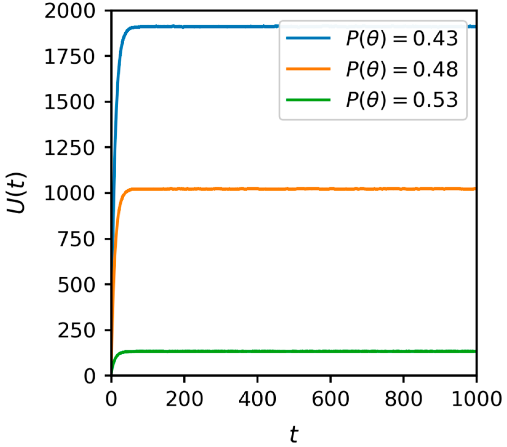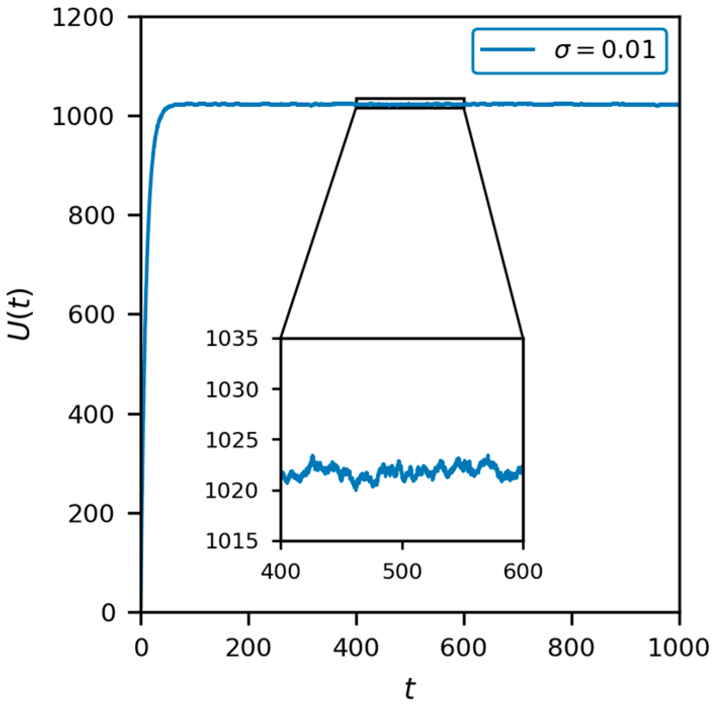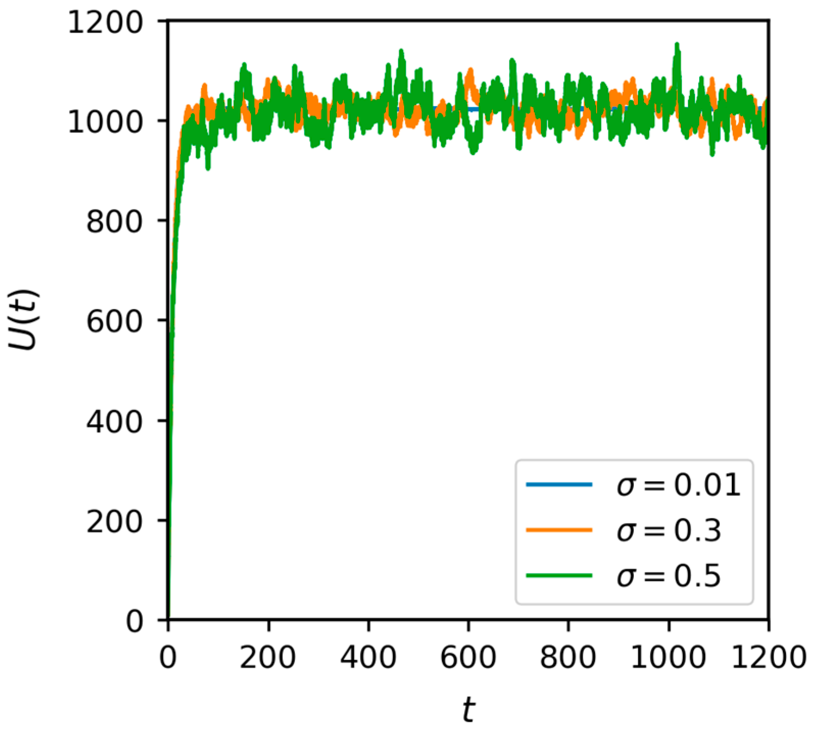 The intensity of random disturbances is set to a low value of σ = 0.01 , representing a base-case environment of relative stability. This allows us to clearly trace the impact of stochastic shocks, with the parameter value itself being informed by empirical estimates of volatility in well-functioning commodity markets, which are typically on the order of 0.5–1% [28,29].