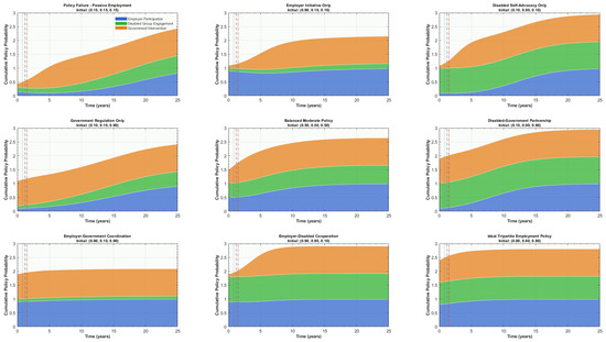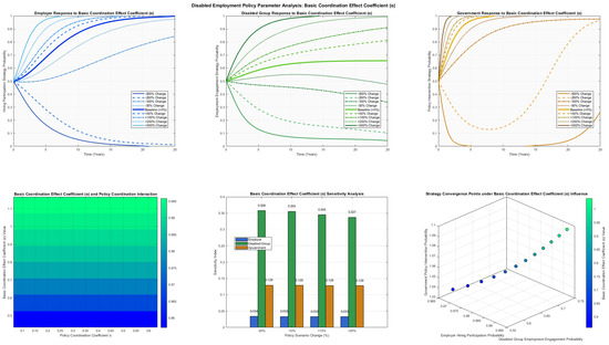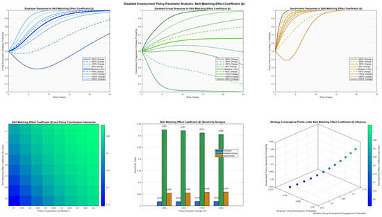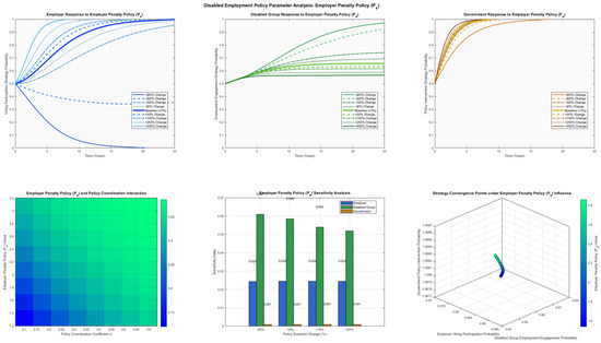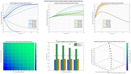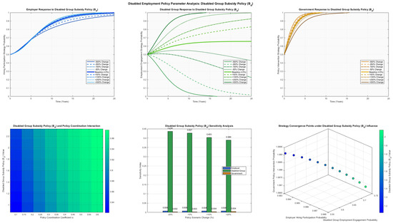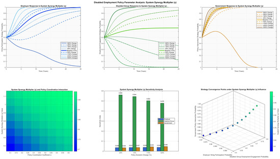 Figure 6 shows that higher values of the system synergy coefficient—capturing economies of scale and network effects when supply and demand “move toward each other”—increase the likelihood that all actors adopt coordinated strategies, enabling faster convergence to the ideal equilibrium (1,1,1). Sensitivity again differs across actors: persons with disabilities are the most sensitive, exhibiting the steepest convergence as the coefficient rises; government displays moderate, steadily positive responsiveness; employers are least sensitive and adjust more gradually. The bar chart in the bottom-middle panel corroborates this ranking.
