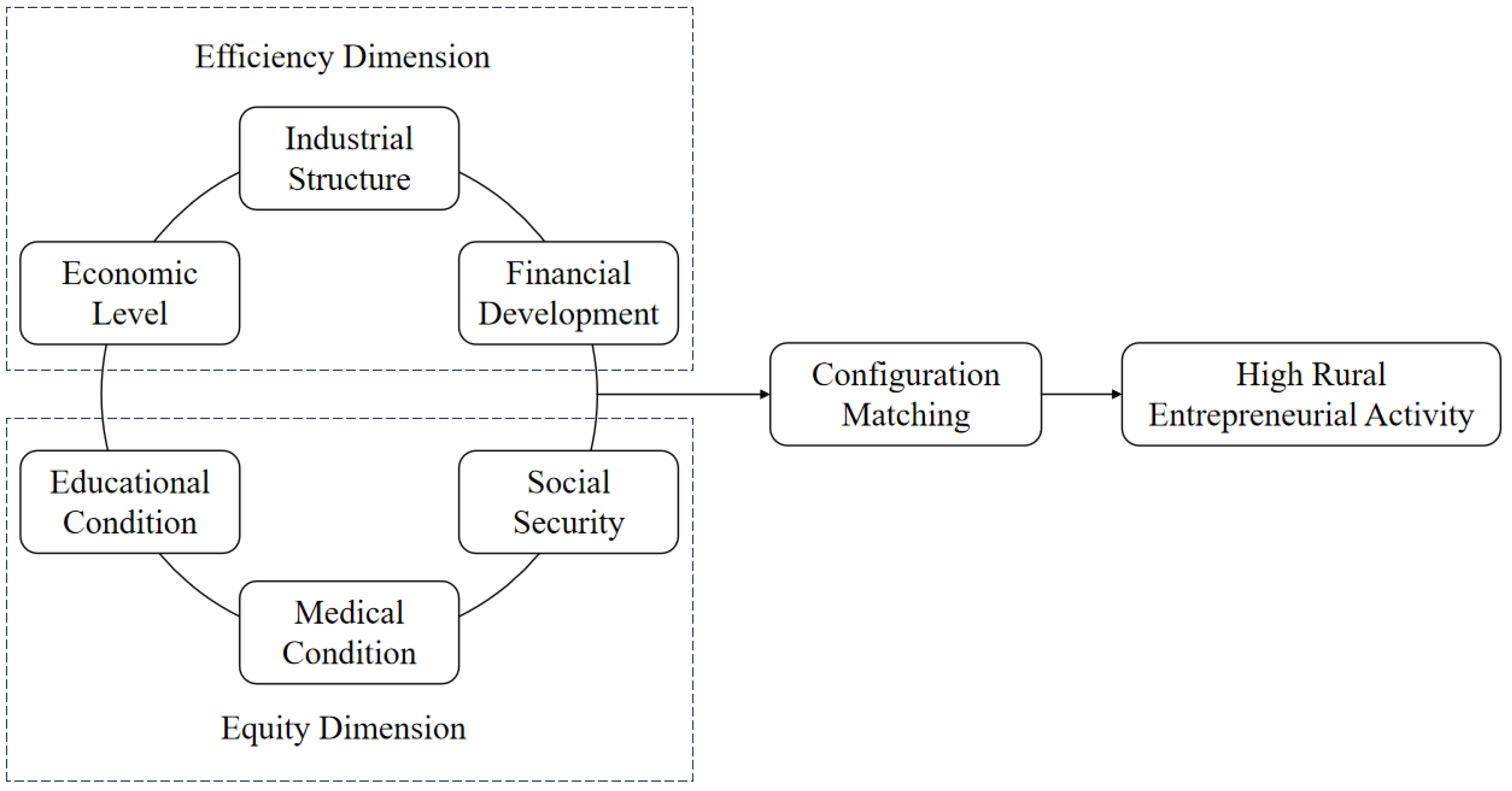 59]. In the equity dimension, perfect educational conditions can provide favorable support for entrepreneurs to accumulate entrepreneurial knowledge and skills, especially to cultivate technical workers and service personnel that match the needs of the tertiary industry, achieving a supply-demand balance between industrial demand and educational supply. At the same time, perfect social security can alleviate entrepreneurs’ concerns about entrepreneurial failure and enhance their willingness to take risks, so they are more willing to accumulate wealth by carrying out entrepreneurial activities. The synergistic mechanism between efficiency and equity lies in that the entrepreneurial opportunities provided by the efficiency dimension elements are highly dependent on the intellectual and social security provided by the fair dimension, so that they can be effectively identified and utilized; and the continuous optimization of the education and social security system is also inseparable from the economic and industrial foundation provided by the efficiency dimension. These factors form a dynamic balance between efficiency and equity, which helps entrepreneurs in rural areas fully utilize their own abilities and thus transform entrepreneurial opportunities into entrepreneurial actions.