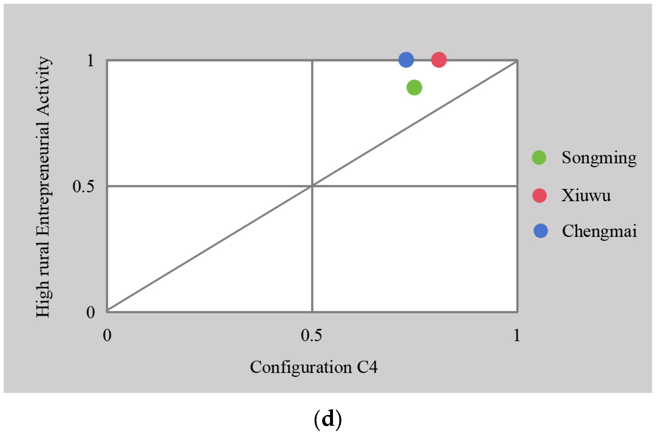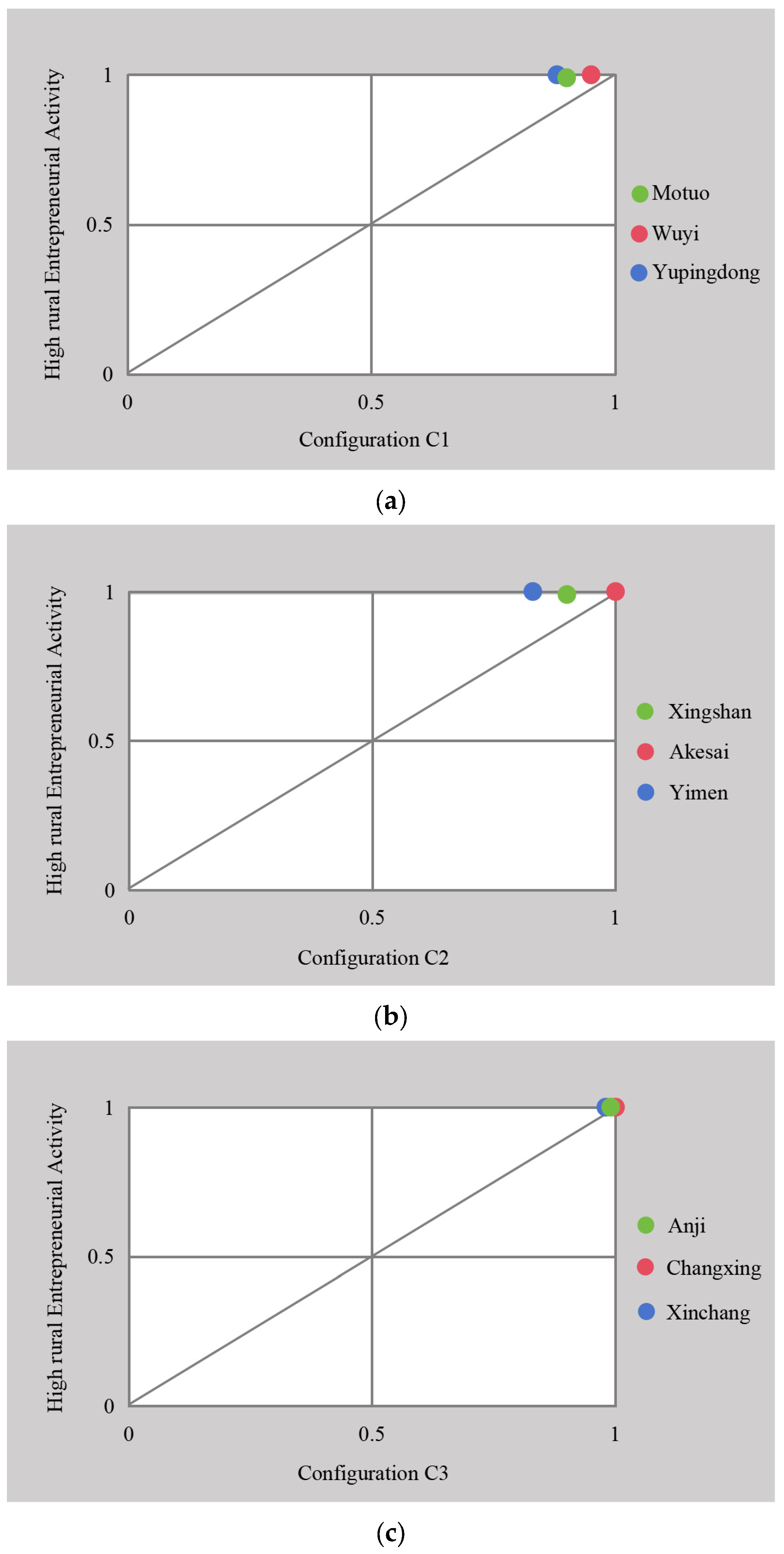 Y-axis indicates the membership degree of the case in the outcome set, that is, the high rural entrepreneurial activity. If the value is 1, it indicates that the case belongs to the high rural entrepreneurial activity completely. Cases positioned in the upper-right corner, which exhibit high membership in both the solution and the outcome, are considered strong typical cases for that configurational path.