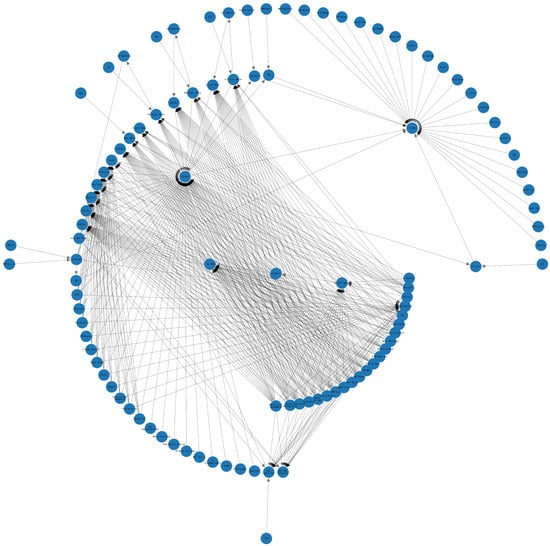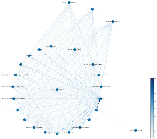 Figure 5, where the depth of the edge color represents the frequency of risk event transmission between industries; the darker the color, the more frequent the risk event transmission. Only risk propagation times greater than 100 are shown. The risk event path with the highest transmission frequency is from “95 Integrated Circuit Manufacturing” to “99 Wafer Testing”, with a total of 4025 transmissions. The downstream industrial chain risks can be traced back to “53 Gallium Nitride Epitaxial Wafer”, “51 Silicon Carbide Epitaxial Wafer”, “50 Silicon Epitaxial Wafer”, and “54 Indium Phosphide Epitaxial Wafer”, with transmission frequencies of 263, 251, 250, and 240 times, respectively. To reduce the industrial chain risks of China’s IC, particular attention should be paid to the “99 Wafer Testing” industry and its upstream industries.