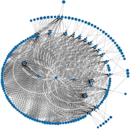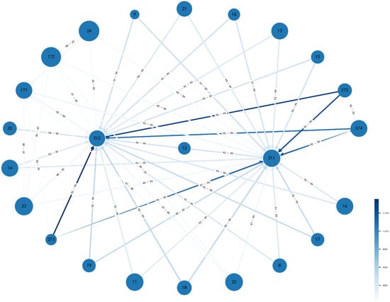 Figure 6, only the risk transmission paths with more than 130 occurrences are displayed in the figure. The path with the most risk transmission occurrences is from enterprise 273 to enterprise 312, corresponding to the industries “95 Integrated Circuit Manufacturing” to “99 Wafer Testing”, with a total of 753 occurrences. The second is from enterprise 272 to enterprise 312, corresponding to the industries “95 Integrated Circuit Manufacturing” to “99 Wafer Testing”, with a total of 710 occurrences. It can be seen that the high-risk enterprises in the “99 Wafer Testing” link of the simulated IC supply chain in this study mainly include enterprises 272, 273, 274, 311, and 312. Moreover, this link is basically consistent with the “99 Wafer Testing” risk chain in the industrial chain risk analysis.
