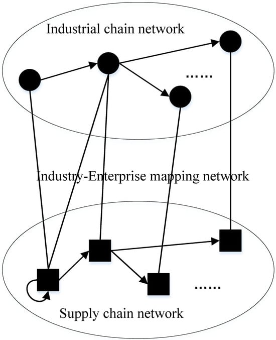 10]. The existing research mostly focuses on the construction of the index system and the system dynamics relationship between the influencing factors of resilience, ignoring the help of the IC industrial chain and supply chain network structure for research. The network structure can vividly describe the characteristics of industrial chain and supply chain and has the potential to model the complex system of the industrial chain–supply chain. Therefore, this study achieved the quantitative modeling of the IC system by constructing a three-layer network. It provides a model foundation for the research on the resilience of the system.