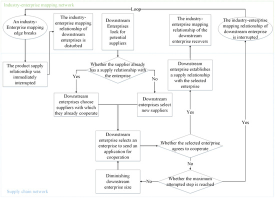 The simulation model is implemented based on python 3.8, the network structure is implemented by NetworkX library, and the ABM is implemented by mesa library. The initial risk event is set to interrupt 363 edges in the industry–firm mapping network one by one and immediately interrupt the supply of the corresponding firm to the downstream. In order to reduce the influence of randomness on the analysis of the experimental results, the experiment was repeated 10 times for each risk event.