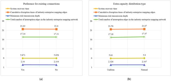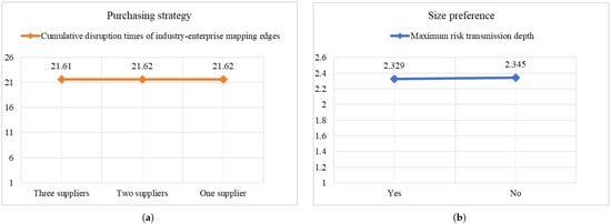 Figure 7a, an increase in the number of suppliers will cause cumulative disruption times of industry–enterprise mapping edges to slightly decrease. Multiple suppliers allow the enterprise to maintain its supply level in the event of a risk to one of the suppliers. From