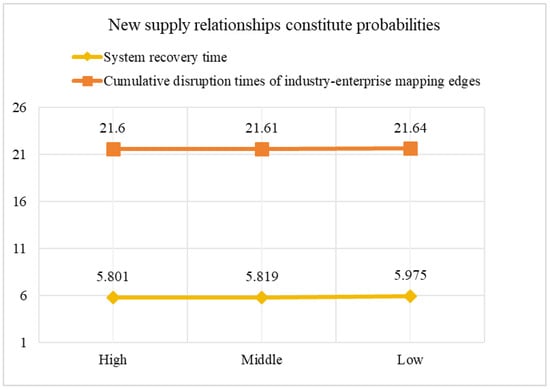 Figure 8, this factor only significantly impacts the system recovery time and the cumulative disruption times of the industry–enterprise mapping edges. As the value of the probability of forming new supply relationships increases, both indicators show a downward trend. The easier-to-achieve new cooperation will enable the system to return to normal more quickly. At the same time, this will also shorten the cumulative duration for companies in a risky state within the system.