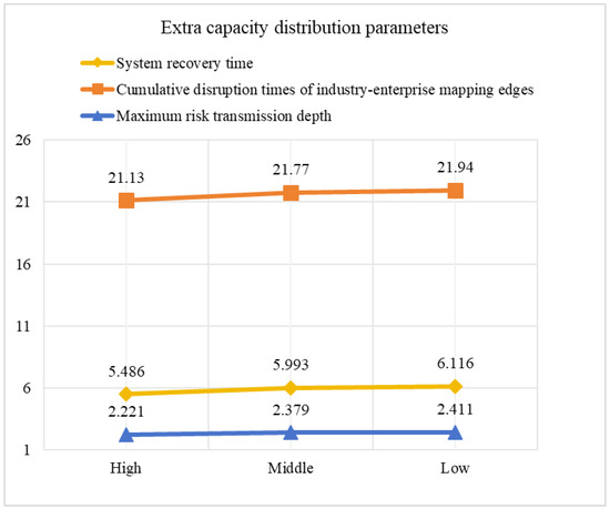 Then comes the distribution parameter of extra production capacity, which significantly influences three indicators: the system recovery time, the cumulative disruption times of industry–enterprise mapping edges, and the maximum risk transmission depth. As shown in