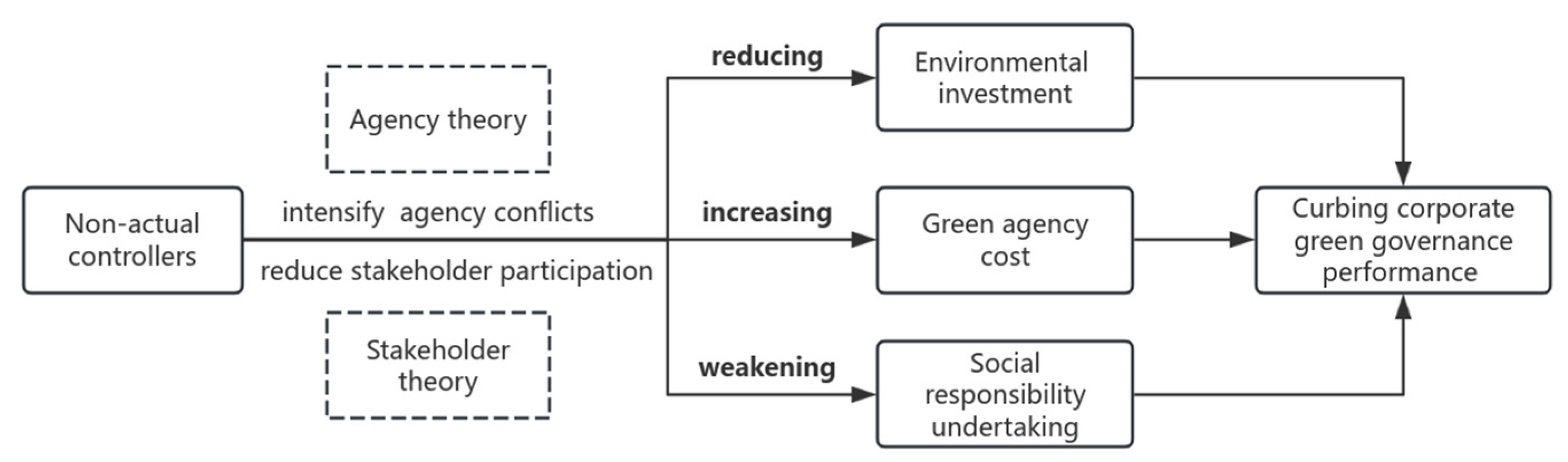 5]. This leads to limited corporate motivation for its implementation. This contradiction is even more prominent in a company system where control rights are absent. Weakened accountability mechanisms and short-term orientation further marginalize green governance in such entities. Our study establishes a system-level analytical framework to examine how non-actual controllers affect corporate green governance performance and its underlying mechanisms. It addresses two core questions: How does this structural deficiency influence green governance, and through what pathways? This study seeks to generate novel insights into the governance of non-actual controller firms and to advance the theoretical foundations for corporate sustainability.