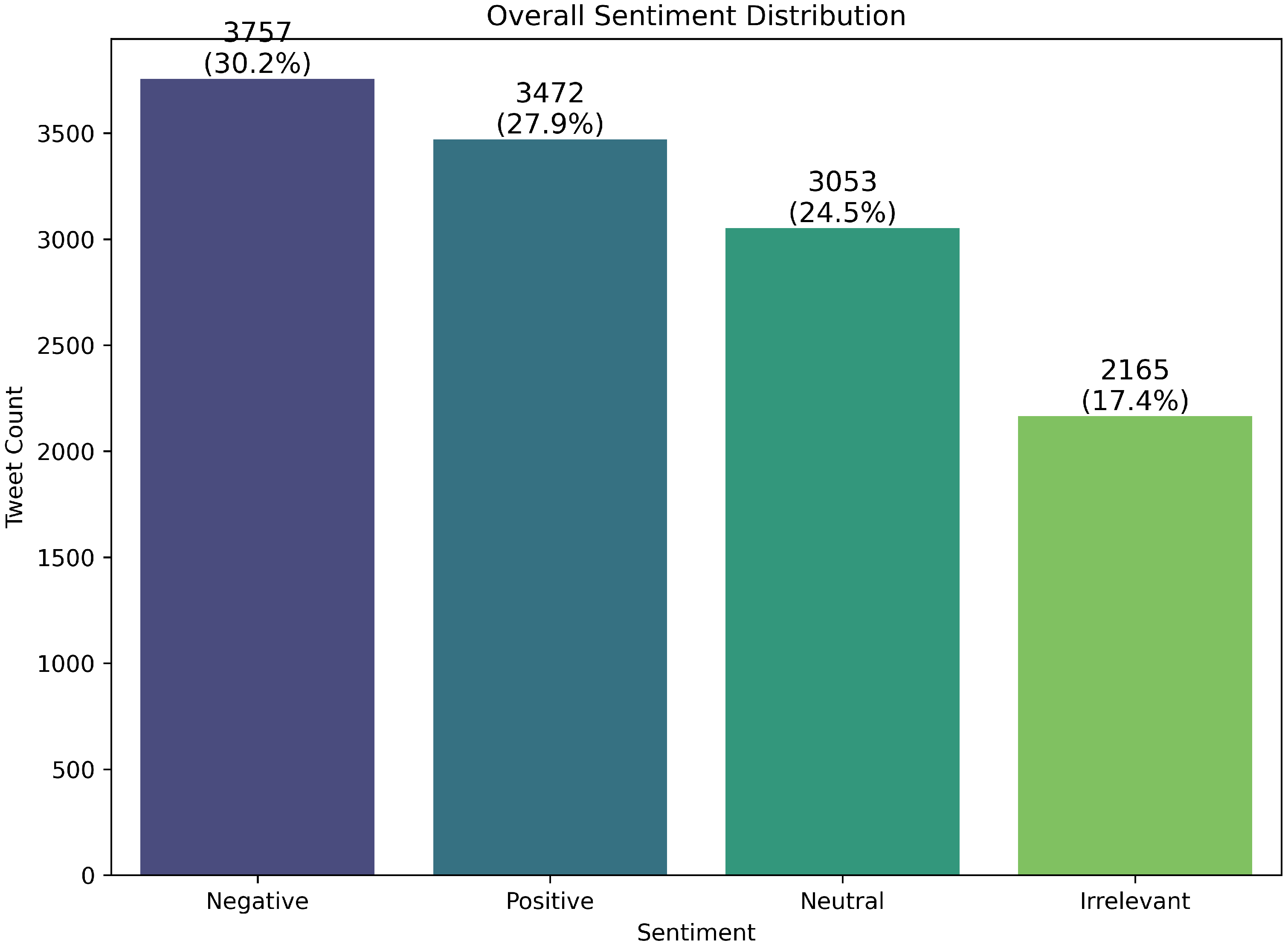The dataset comprises annotated Twitter posts targeting multiple entities (e.g., products, companies, events), each sorted into one of four sentiment categories: Positive, Negative, Neutral, or Irrelevant. The tweets reflect a realistic distribution of class imbalance, with roughly 30% Negative, 28% Positive, 25% Neutral, and 17% Irrelevant. The data include multilingual content and typical Twitter noise such as Uniform Resource Locators (URLs), emojis, hashtags, and user mentions—characteristics consistent with publicly available datasets [