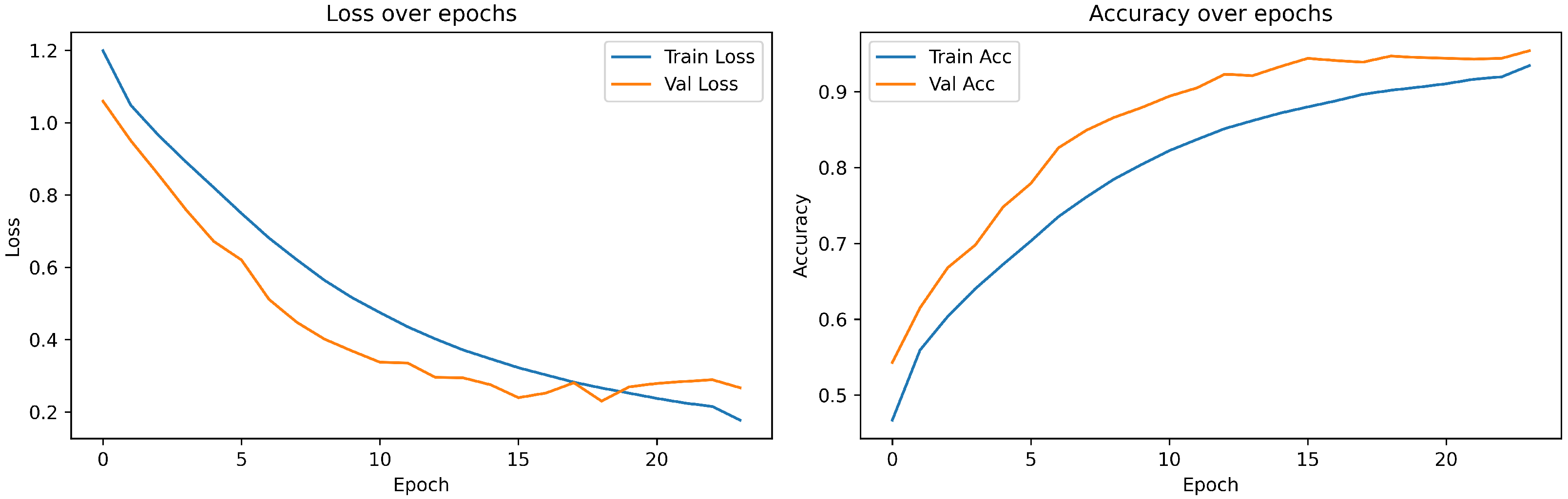 In this section we quantify training dynamics and summarize final classification behavior. The figures below are intended to answer the following questions; Did training converge stably? Is the generalization gap acceptable? Where do errors concentrate?