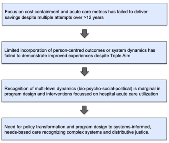 Acute care is demonstrably a complex system [17,18]. A complex system has so many interacting parts that it is difficult, if not impossible, to influence the behavior of the system based on interventions in its component parts. Superutilization (frequent use) follows the expected pareto distribution 80:20-rule of acute hospital utilization metrics. Complex systems exhibit non-linearity driven by attractors—individuals in their social contexts, services, and policies do not follow normal distributions [18,19].