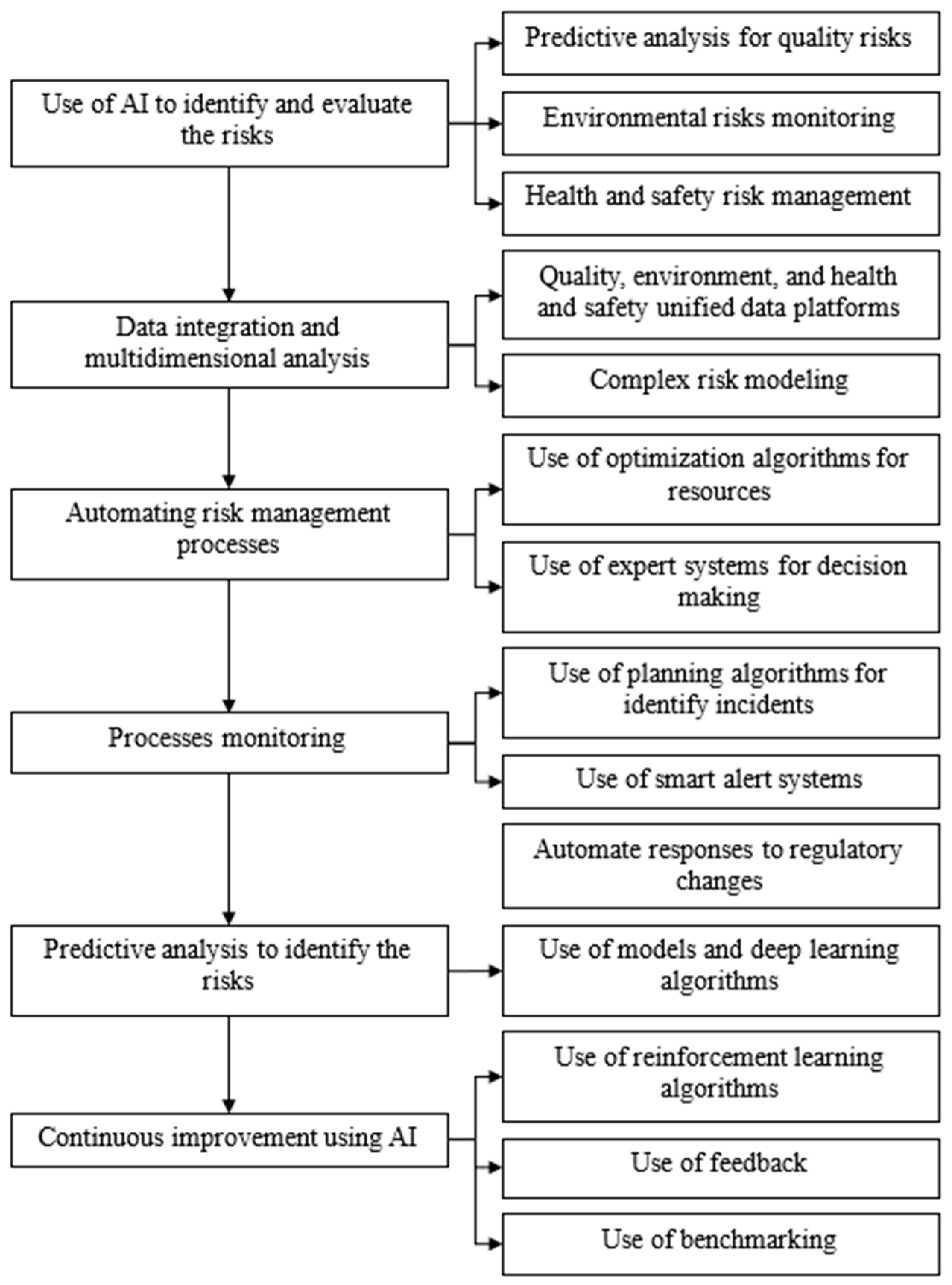 | 11. | Decision support and IMS risk management | AI allows for the identification of trends and the anticipation of operational, environmental, or OHSAS risks | [26,28,50,61,62] |