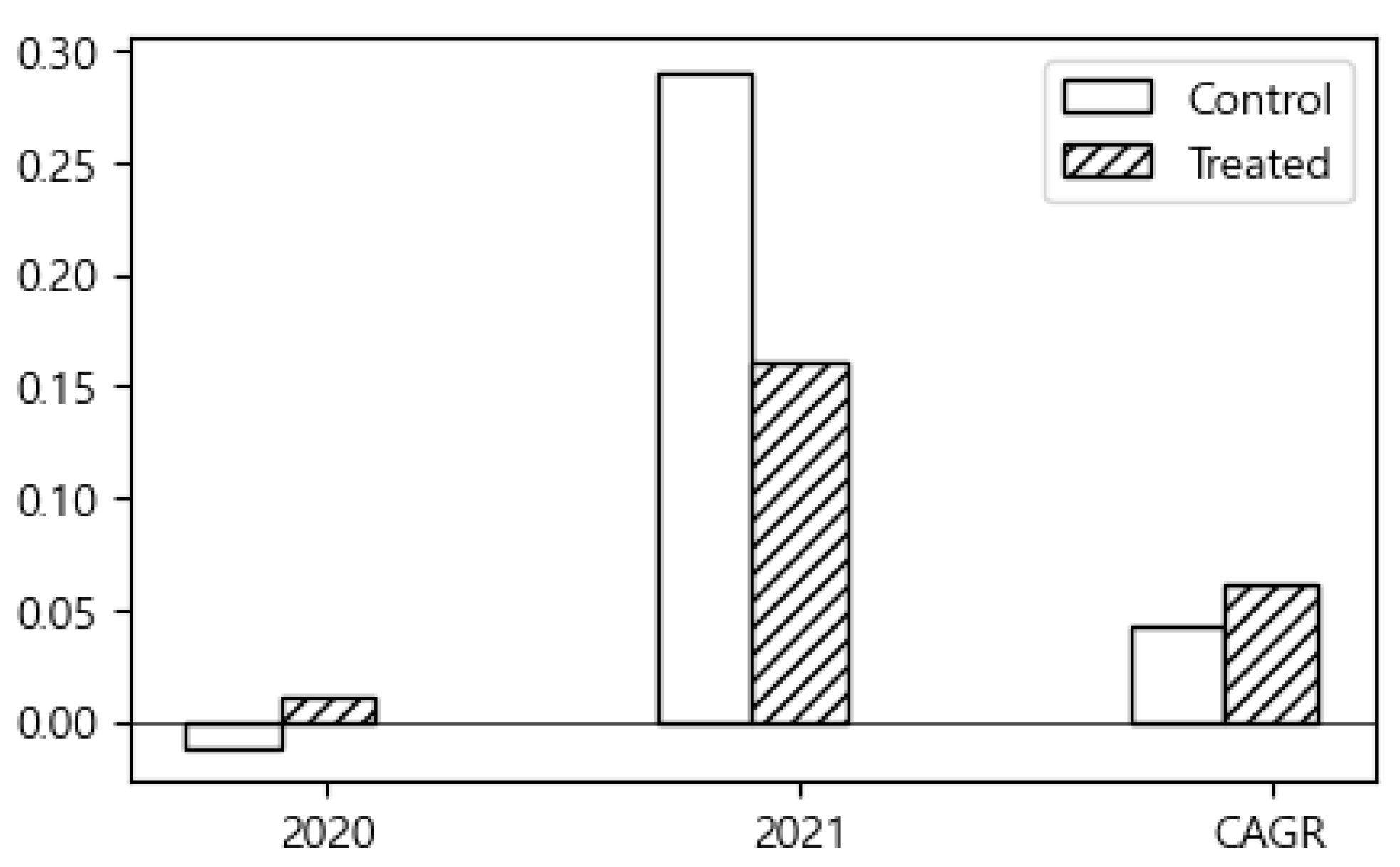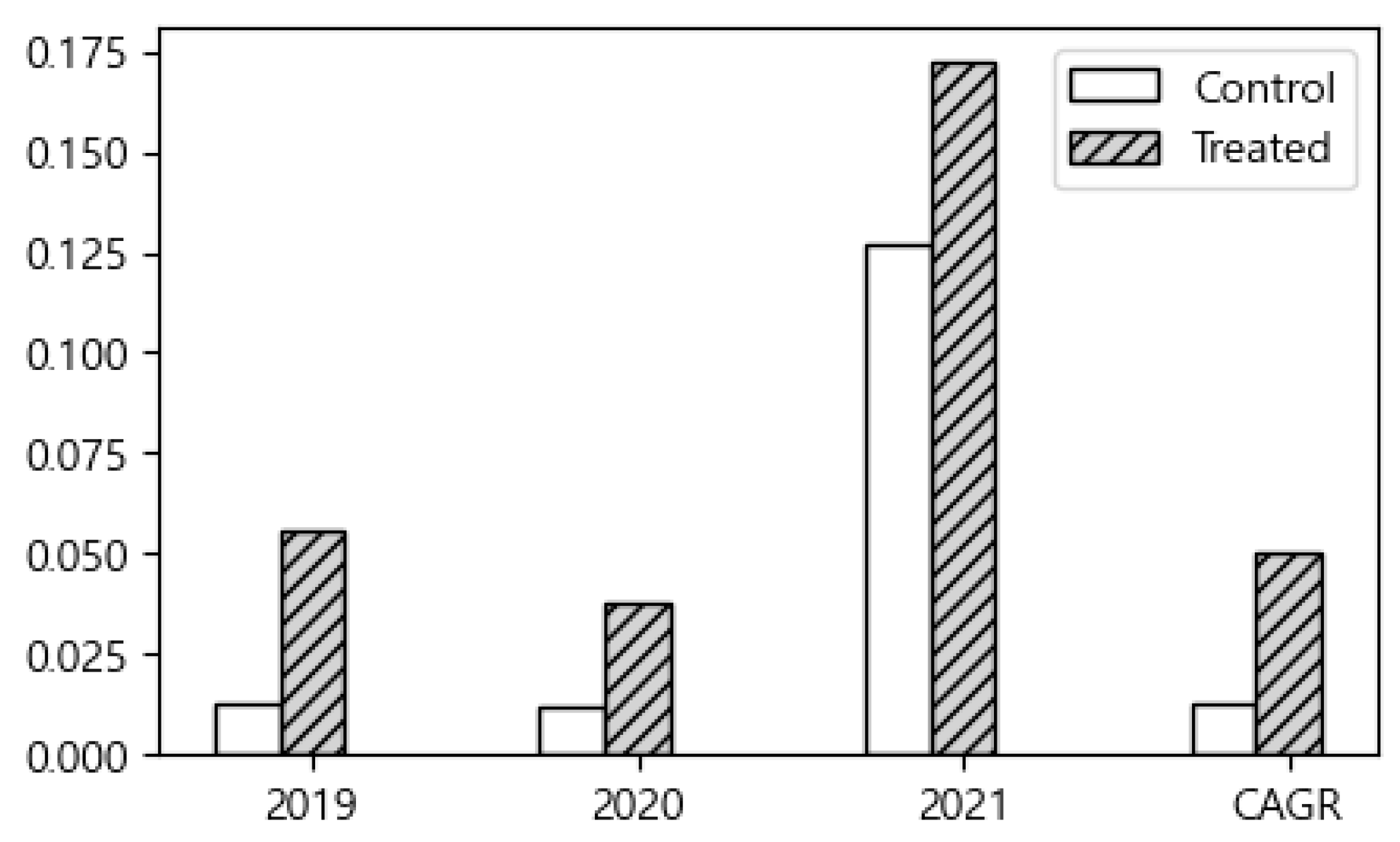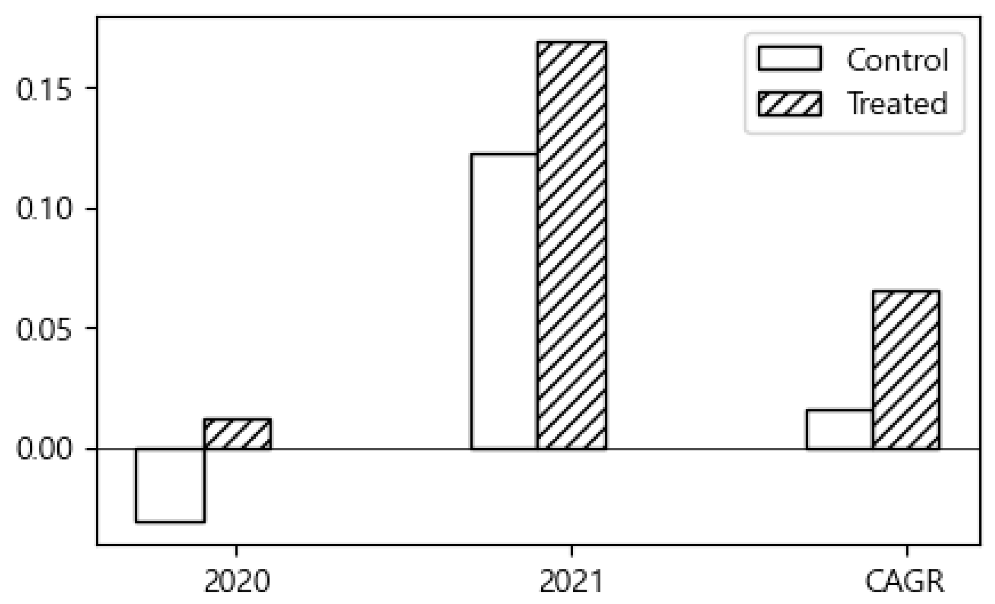 After ensuring comparability between the control group (non-recipient firms) and the treatment group (recipient firms) through PSM, this study conducted an outcome analysis to estimate the net effect of the policy intervention. The analysis focused on firms that established smart factories in 2019 and 2020, with policy effects evaluated primarily through annual sales growth rates and CAGR, using completed 1:1 matching with corresponding non-recipient firms.