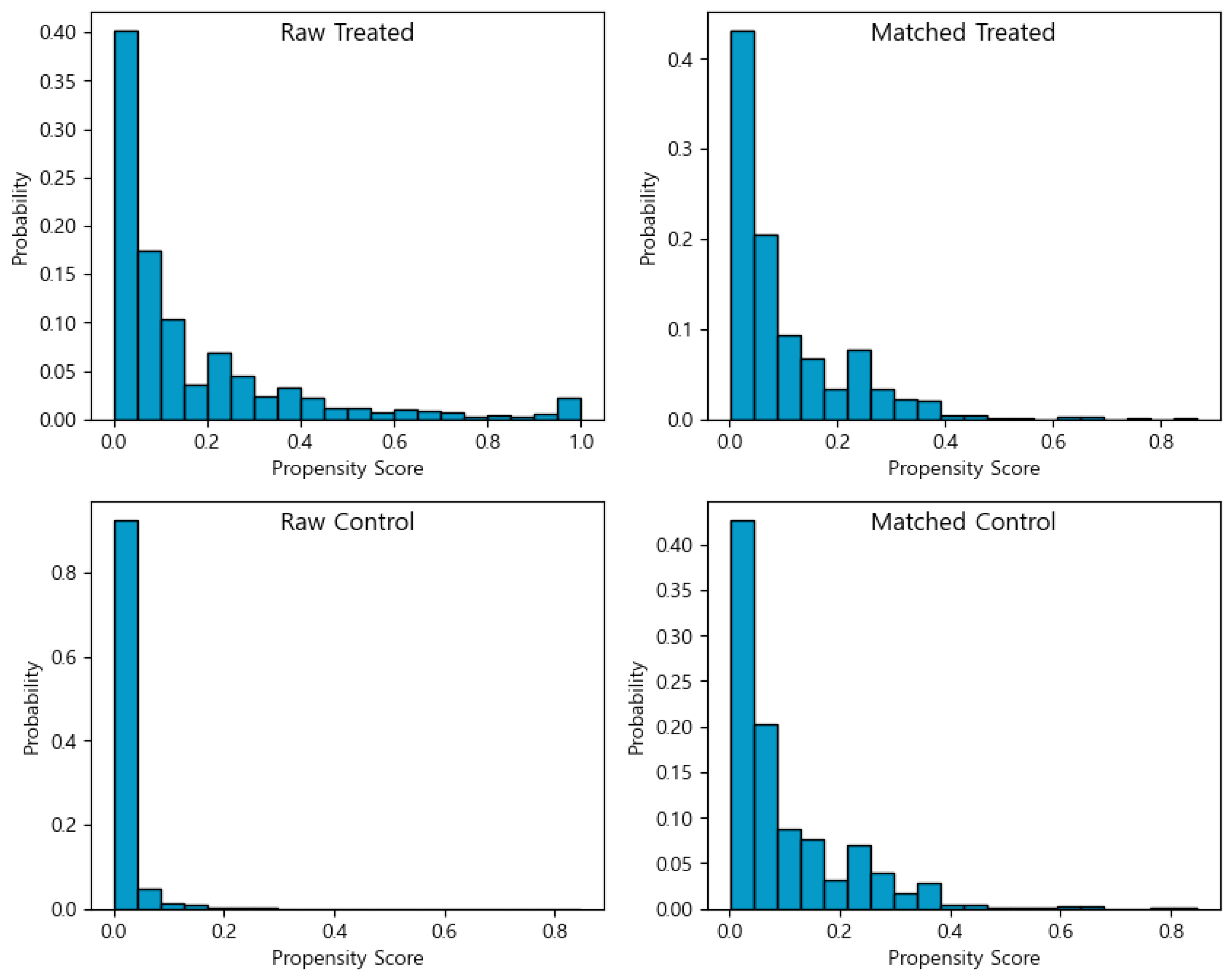 As shown in both figures, a clear imbalance existed between the treated and control groups prior to matching. However, following PSM, the two groups exhibit highly similar propensity score distributions. Since the propensity score represents the joint influence of observed confounding variables, the similarity of the post-matching distributions suggests that the confounding influence was successfully balanced across the groups. In other words, the effect of confounding variables on treatment assignment was effectively mitigated, thereby improving the validity of subsequent causal effect estimation.