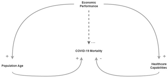 Our results supported the assumption that higher GDP was associated with higher population age and more performant healthcare systems (represented by variables Vacc. and UHC). Higher population age and more performant healthcare systems were in turn associated with higher and lower COVID-19 mortality, respectively. Accordingly, a country’s economic performance (expressed in our model through GDP) simultaneously attenuates COVID-19 mortality through better healthcare (healthcare branch) and amplifies mortality through older populations (age branch).