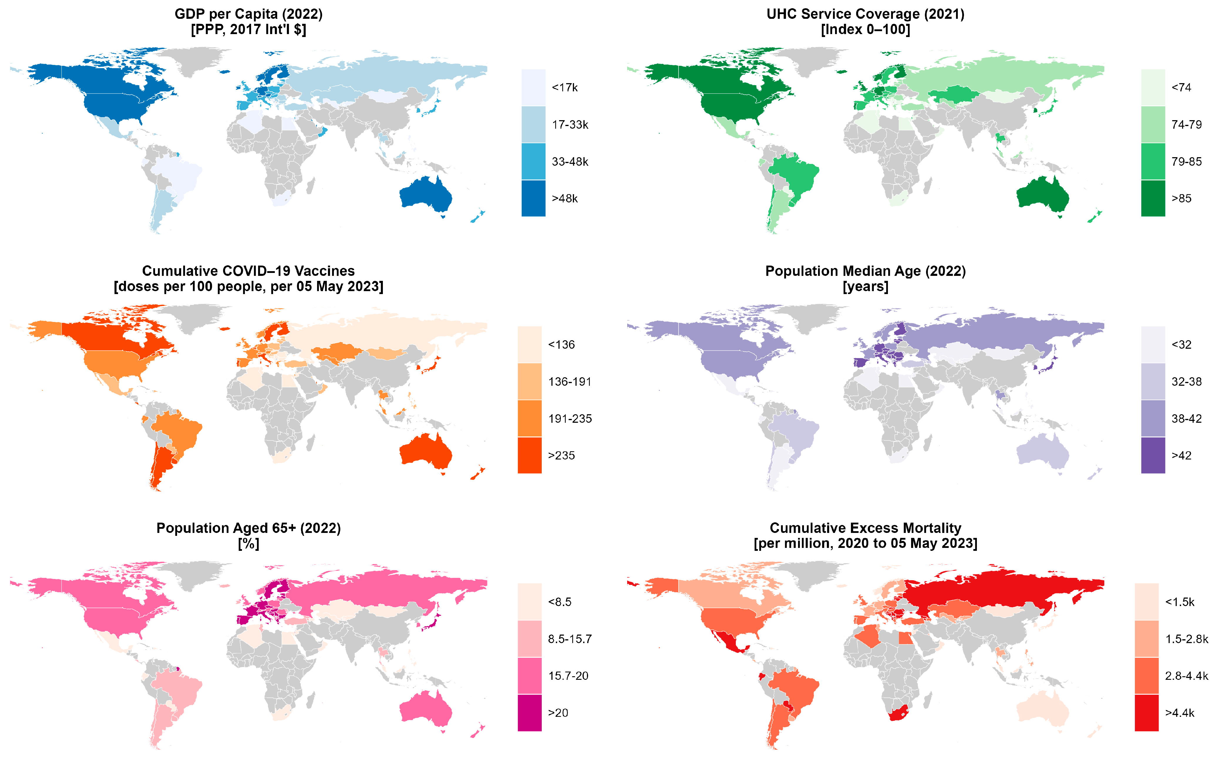34]. Accordingly, we used the cumulative excess mortality per million between 1 January 2020 and 5 May 2023 (end of the PHEIC) to represent COVID-19 mortality. This data was obtained from WHO.