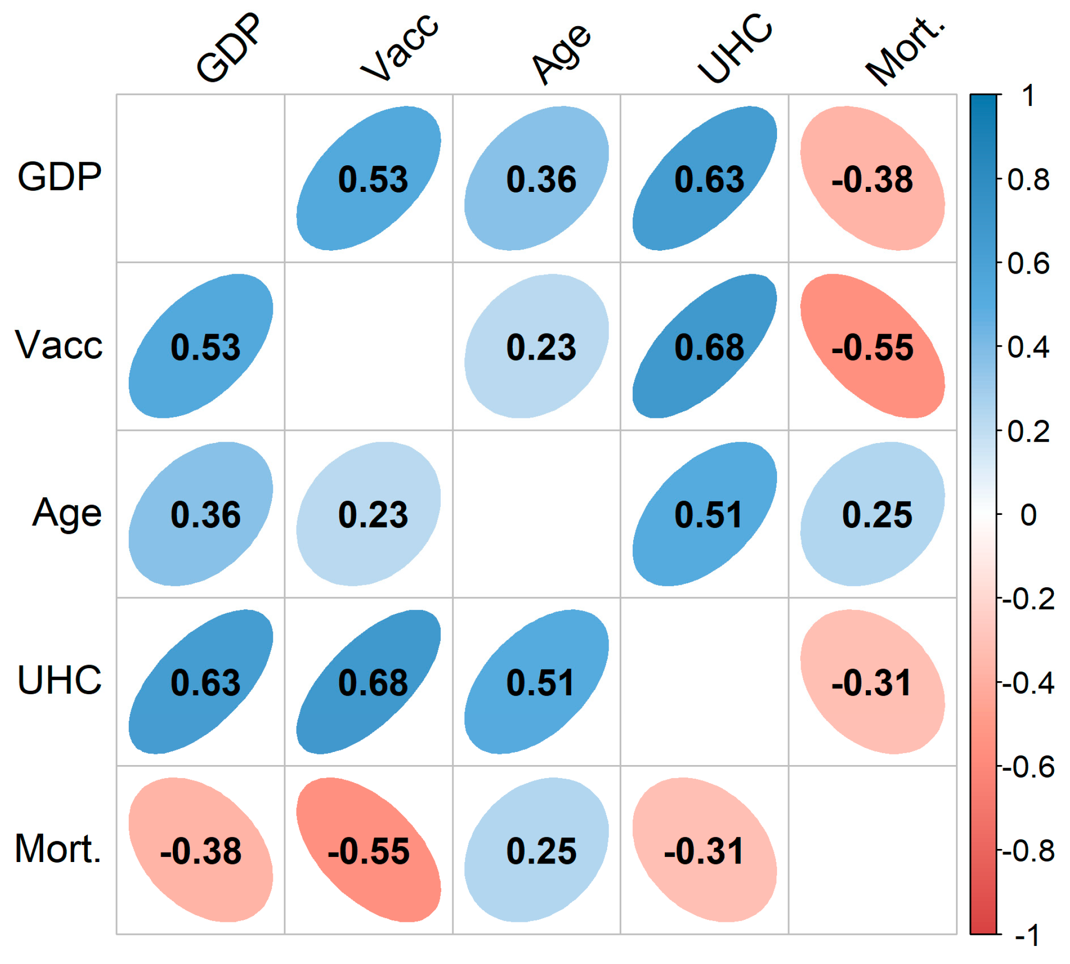 Despite the simplifications in our model, the direction of the correlation coefficients aligned with the assumptions underlying the economy-mortality nexus: GDP was positively related to age and healthcare variables (Vacc. and UHC). Healthcare variables were negatively related to mortality, and age had a positive correlation with mortality.