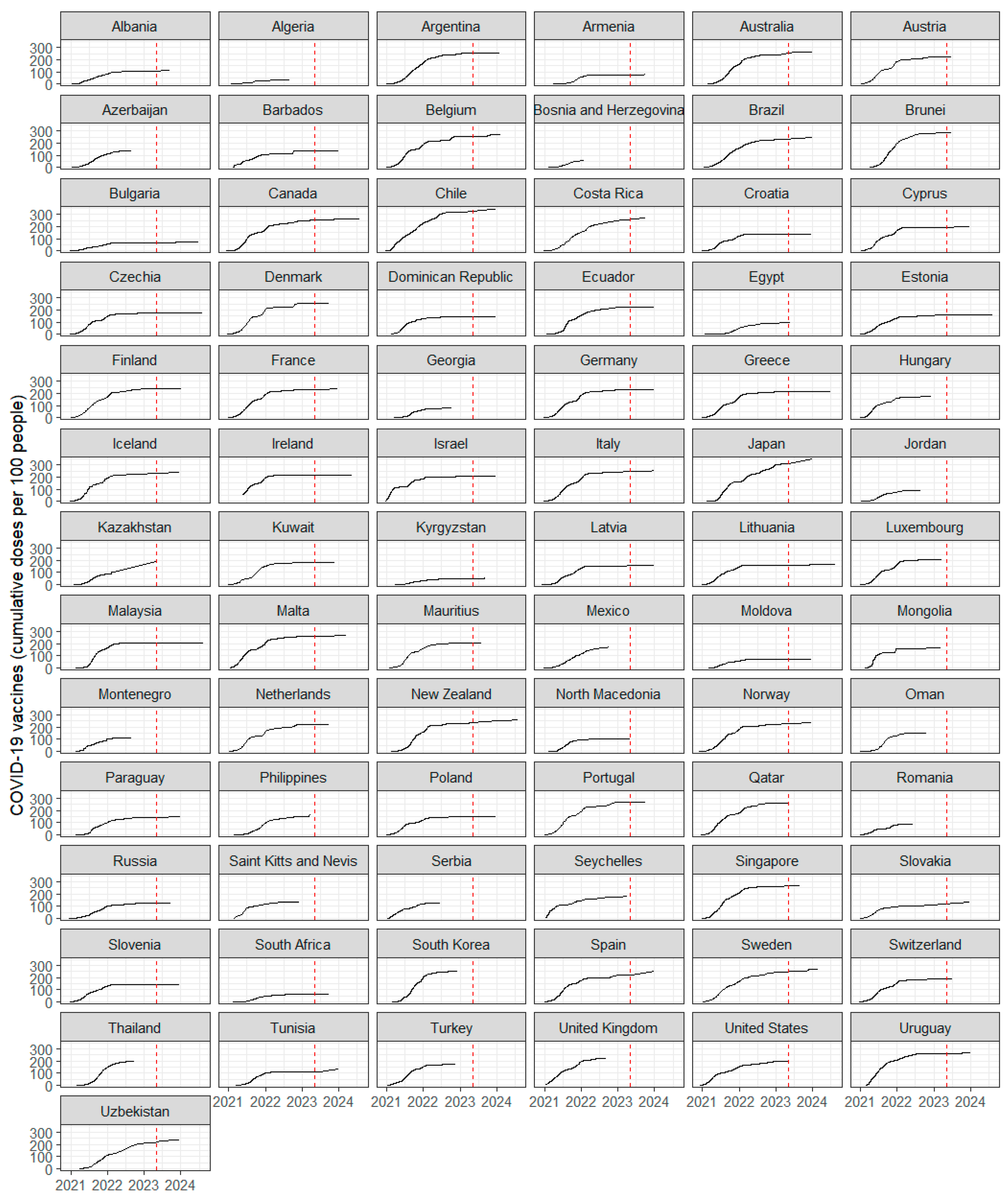 Moreover, the cumulative number of vaccination doses administered per 100 people (sourced from Our World in Data) until the end of the PHEIC (Public Health Emergence of International Concern) on 5 May 2023 (according to WHO) was considered as a second variable to represent healthcare capabilities by country. If vaccination data were unavailable for 5 May 2023, we used the closest available data point (