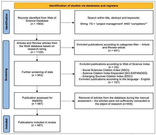 The initial search resulted in 1563 articles retrieved in accordance with the defined search parameters, after which the sample was filtered in several steps using inclusion/exclusion criteria (see Figure 1). In the first step, the search was restricted to the publications according to categories—articles and review articles—as central in research impact, resulting in 1122 articles. In the second step, the search was restricted according to Web of Science Index—SSCI, SCI-EXPANDED and ESCI—and language (English), ensuring a certain standard of scholarly rigor, and reliable and consistent foundation for analysis. This step resulted in 942 articles. The third step involved a detailed manual assessment by the authors. During this step, the authors eliminated articles after checking the titles, abstracts, and keywords and, in cases of doubt, reading bodies of the articles, followed by discussion and reaching a consensus on the alignment of the articles with the research topic to ensure the attention was on project management and project management competence. At the end of this step, 455 papers were removed and were not considered in the remaining stages of the analysis as they were not sufficiently connected to the object of research.