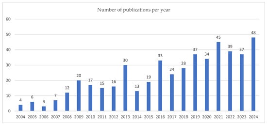 The analyzed articles were published in the period 2004–2024 with the first notable growth in 2009, and there has been a fluctuating but overall increasing trend in publications since 2009 to the highest number in 2024. The distribution of published articles by year shows that 10.68% of articles were published between 2004 and 2009, 18.69% between 2010 and 2014, and 28.95% between 2015 and 2019, while the majority, 41.68%, were published between 2020 and 2024 (Figure 2).