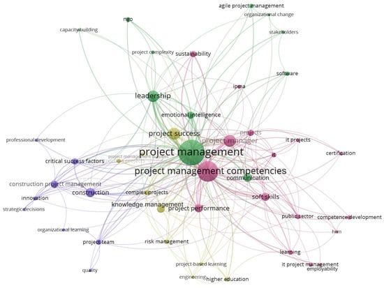 The bibliometric analysis identified four distinct clusters of author keywords representing research areas emerging from the observation of project management and competence (see Figure 3). Keywords with a high degree of correlation appeared within the same cluster as they were connected to the same research topic []. The cluster names were assigned by the authors, based on the frequency of the occurrence of the keywords, and the cluster colors were adjusted using Paul Tol’s muted palette to ensure they could be perceived by individuals with color blindness, as recommended by Katsnelson (Table 2) [].