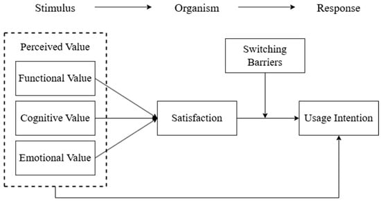 Perceived value theory provides a comprehensive foundation for distinguishing the three dimensions of user evaluation toward AI Digital Human Advisors. Functional value reflects utilitarian benefits and innovation efficiency; cognitive value captures rational assessments of informational clarity, credibility, and accuracy; and emotional value concerns affective responses such as enjoyment, warmth, and human-likeness [7,9,14]. Within the Stimulus–Organism–Response (S–O–R) framework [2], these three value perceptions act as stimuli that generate the organismic state of satisfaction, which in turn leads to the response of usage intention [27]. Switching barriers function as a contextual moderator that dampens the translation of satisfaction into behavioral intention, reflecting psychological or procedural friction in AI-mediated service use.