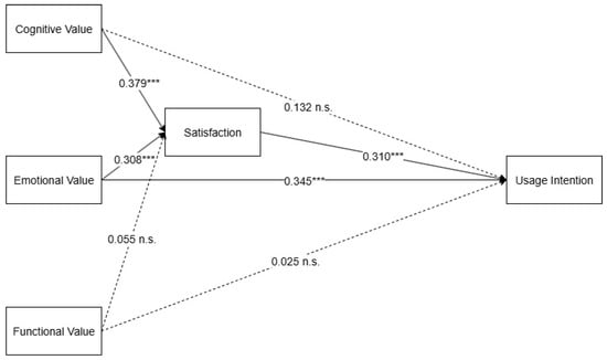 This section presents the direct effects of perceived value dimensions on user satisfaction and usage intention. The structural model yielded mixed results. Functional value did not significantly predict satisfaction (β = 0.055, p = 0.504), thus failing to support H1. This suggests that offering practical functionality alone may be insufficient to enhance users’ overall satisfaction. In contrast, cognitive value had a significant positive effect on satisfaction (β = 0.379, p < 0.001), supporting H2 and indicating that users’ perceptions of the advisor’s intelligence and expertise are critical to generating a positive evaluative response. Emotional value also significantly predicted satisfaction (β = 0.308, p < 0.001), lending support to H3 and emphasizing the role of affective engagement and perceived warmth in shaping user experiences. The complete structural model and standardized path coefficients are presented in Figure 2.