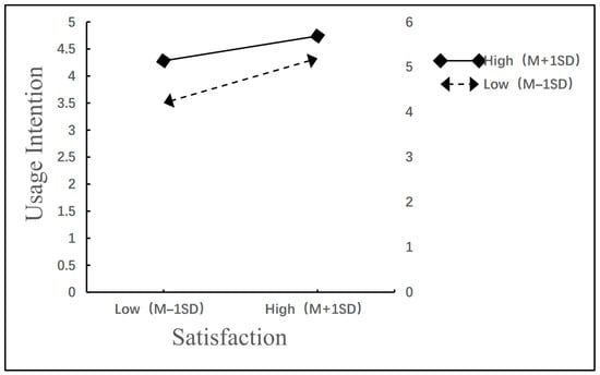 In this study, switching barriers are conceptualized as a multidimensional construct comprising switching costs, alternative attractiveness, and habit. These dimensions collectively represent users’ perceived resistance to change in AI-mediated financial services. When switching costs are high, users anticipate losses of time, effort, or accumulated experience; when alternative attractiveness is low, they perceive limited benefits from changing platforms; and when habitual patterns are strong, they display inertia that discourages behavioral change. Consequently, even satisfied users may hesitate to continue engaging with AI Digital Human Advisors when these barriers are salient. Therefore, switching barriers are theorized to negatively moderate the satisfaction–usage intention relationship, weakening the extent to which satisfaction translates into behavioral commitment. This conceptualization aligns with prior findings in service marketing and digital adoption research, where similar frictional mechanisms reduce the behavioral impact of satisfaction [46,47,48]. From a behavioral standpoint, switching barriers are expected to negatively moderate the relationship between satisfaction and usage intention—that is, while satisfaction generally promotes usage intention, this positive effect weakens when users perceive high switching barriers, rather than reversing its direction. Specifically, when switching barriers are high, even satisfied users may hesitate to deepen their commitment due to perceived risks or friction. Conversely, when switching barriers are low, satisfaction plays a more decisive role in shaping usage intention. Accordingly, the following hypothesis is proposed: