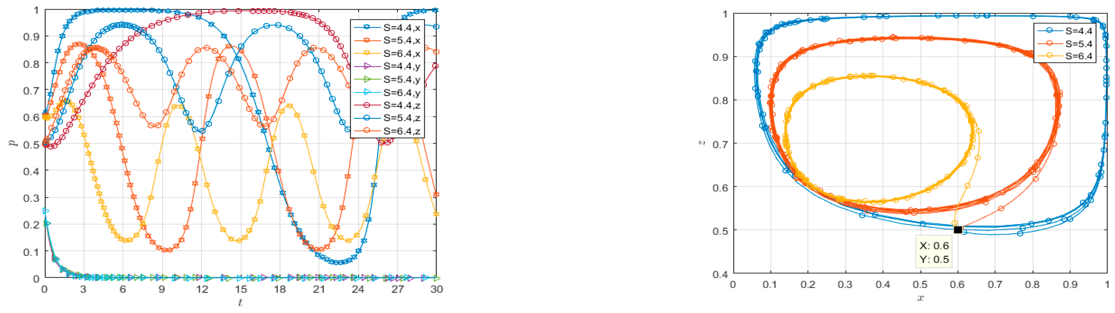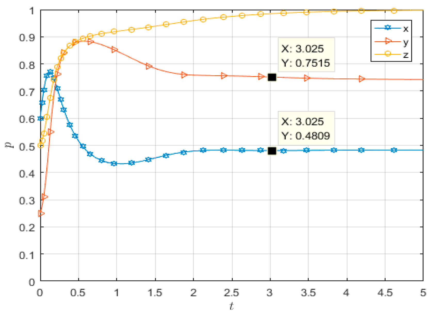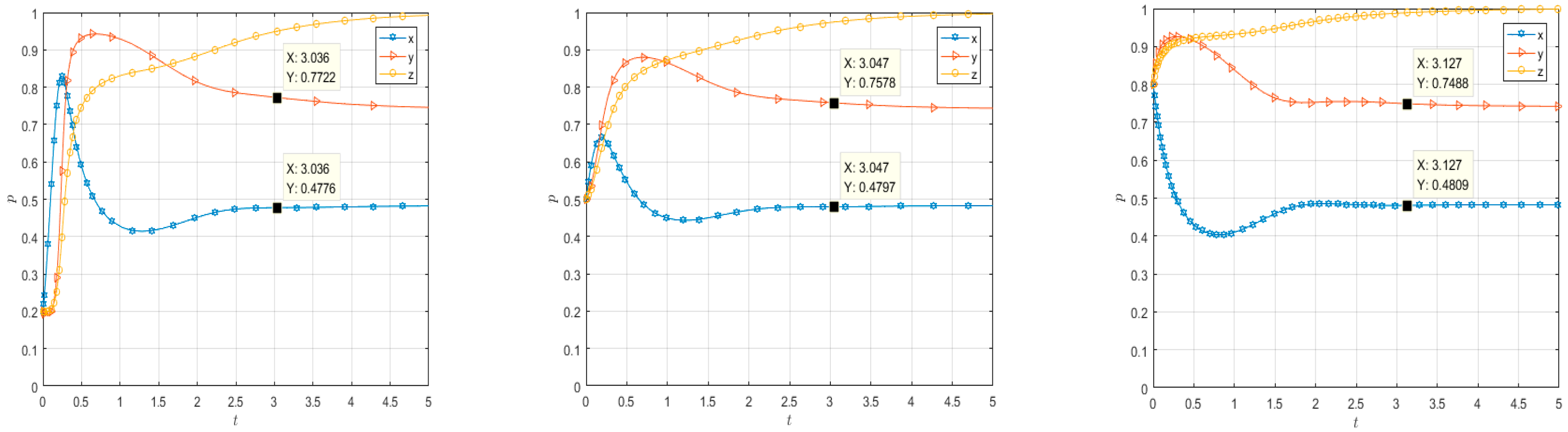 4.2. Numerical Simulation of Three-Party Evolutionary Game