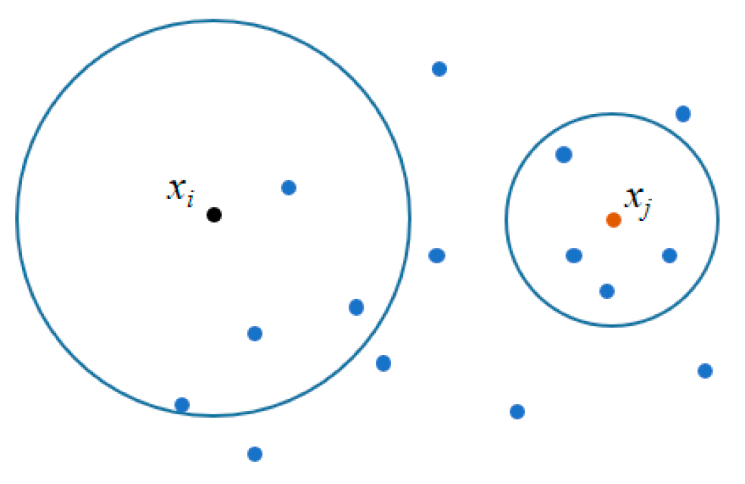 Definition 1 ([21]). Local density ρi. The local density ρi of a data point xi is defined as follows:where is the Euclidean distance between two data points xi and xj defined in Formula (1); the function (adopting the notation from [21]) is defined as χ(x) = 1 if x < 0 and χ(x) = 0 otherwise; and dc is a cutoff distance. Basically, ρi is equal to the number of points that are closer than dc to data point xi. As a general guideline, the cutoff distance dc may be selected such that the mean number of neighbors falls within approximately 1–2% of the total dataset size.